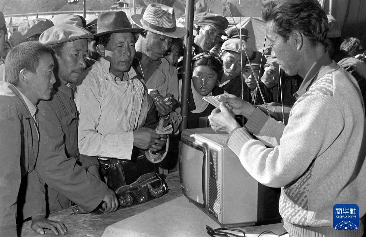 西藏聂拉木县宗堆公社社员阿旺(左三)开茶馆做生意,收入了4万多元。图为他在日喀则贸易公司购买了一部彩色电视机。(1984年11月17日发)