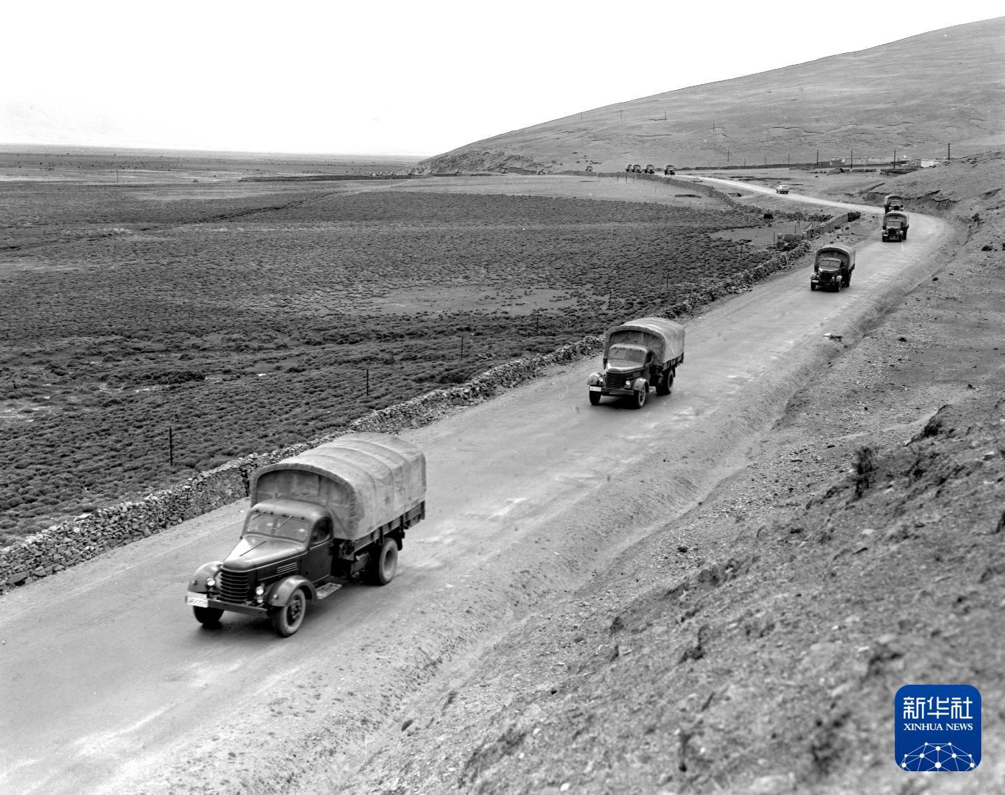 国家重点建设项目青藏公路改建工程,经过筑路军民12年的艰苦奋战后全部竣工。这是满载物资的汽车行驶在青藏公路上。(1985年8月13日发)