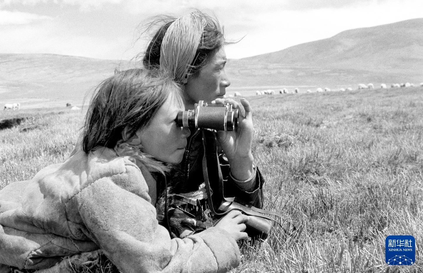 西藏自治区班戈县牧民次仁顿球(右)和热巴俩弟兄用望远镜观察畜群。(1987年10月7日发)
