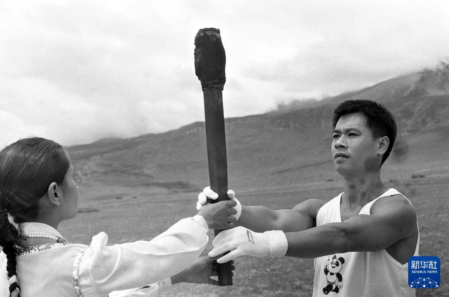 1990年8月7日,第十一届亚运圣火火种在西藏取得。这是负责采集火种的15岁的藏族姑娘达瓦央宗(左)将火种交给运动员李宁。