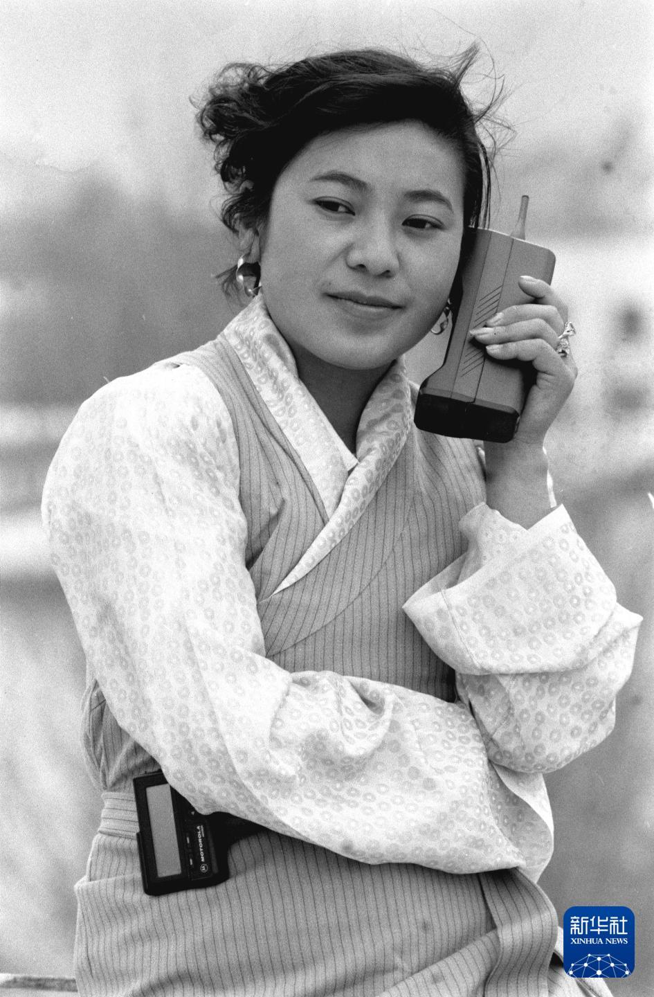 腰挂BP机、手持“大哥大”的藏族女商人拉珍正和四川的客户洽谈生意。(1994年5月31日发)
