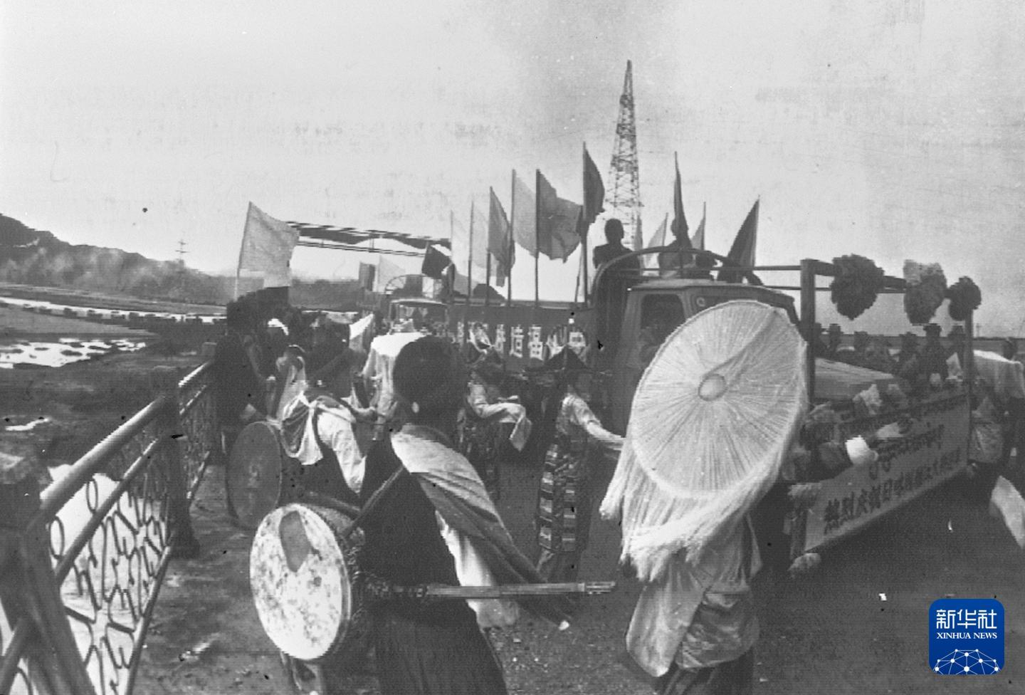 1995年8月27日,西藏日喀则雅鲁藏布江大桥建成通车。它的建成结束了日喀则地区无大桥、长期靠牛皮船渡河的历史。这是当地人民载歌载舞,庆祝大桥建成通车。