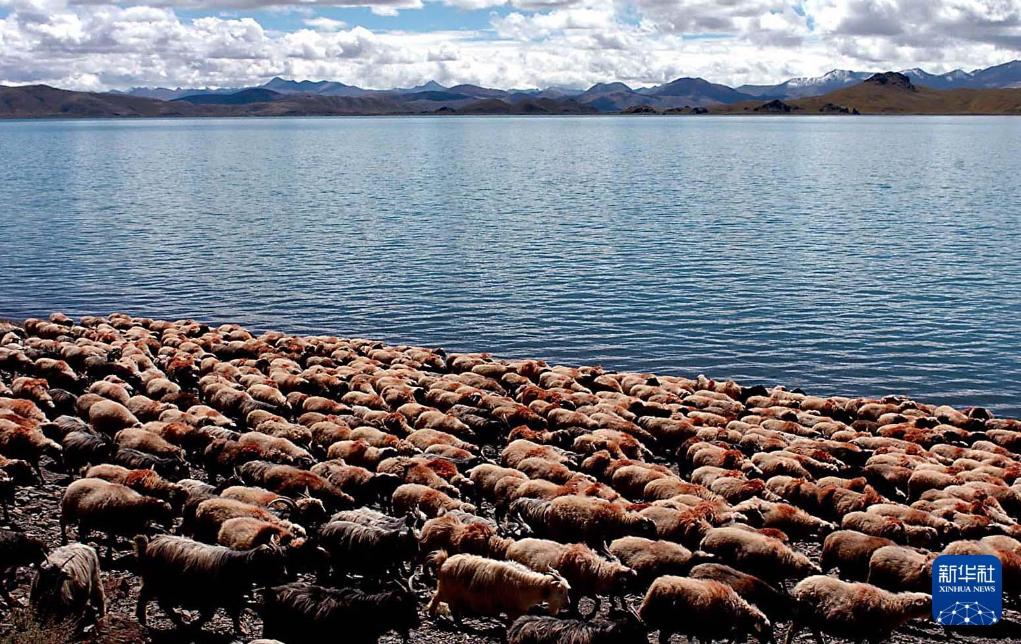 羊卓雍错边的羊群。羊卓雍错藏语意为“碧玉湖”。当地百姓流传着这样一首民歌:“天上的仙境,人间的羊卓;天上的繁星,湖畔的羊群。”(2004年9月19日摄)
