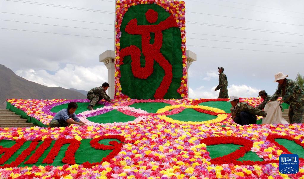2008年4月29日,拉萨市园林工人在布置花卉景观。当时,拉萨市区的主要街道摆放了花卉和奥运标志,迎接北京奥运会倒计时100天。