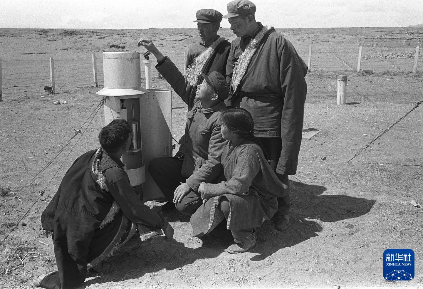 1976年陈金水在西藏海拔4800多米的安多气象站,手把手地向年轻的藏族气象工作者传授技术。