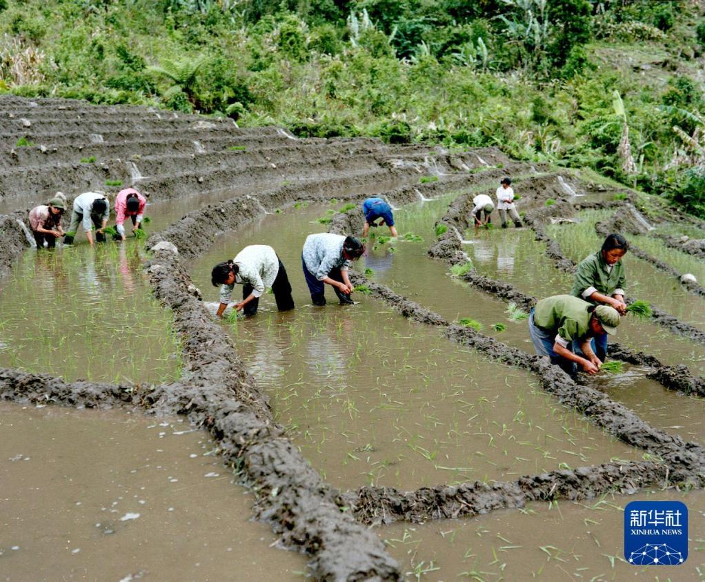墨脱县门巴族社员在稻田里插秧。当时的门巴族人民修了梯田,常年耕作,增加土地肥力,使粮食产量逐年上升。(1983年11月22日发)