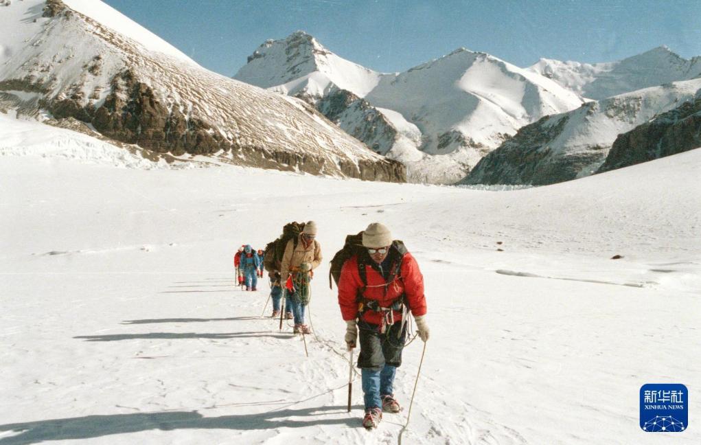 1986年5月10日至11日,中国—日本长野联合登山队的24名队员分两批成功登顶位于西藏定日县内海拔7541米的章子峰。图为登山队员结组向峰顶进发。