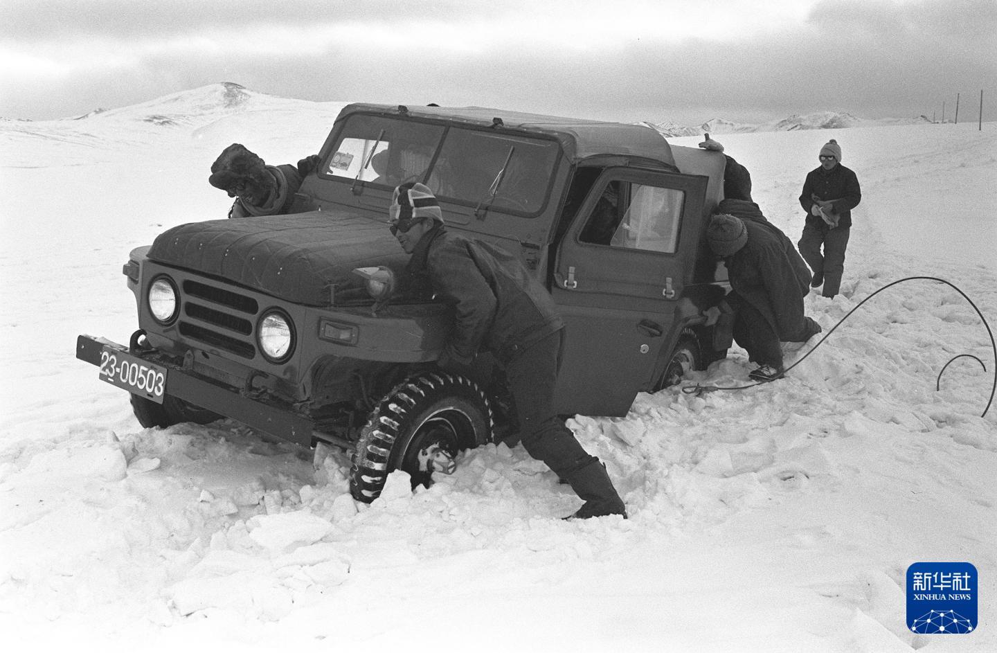 1989年,青藏公路沿线,一辆汽车陷入积雪。这是道班工人协力抬车脱困。(1989年4月29日发)