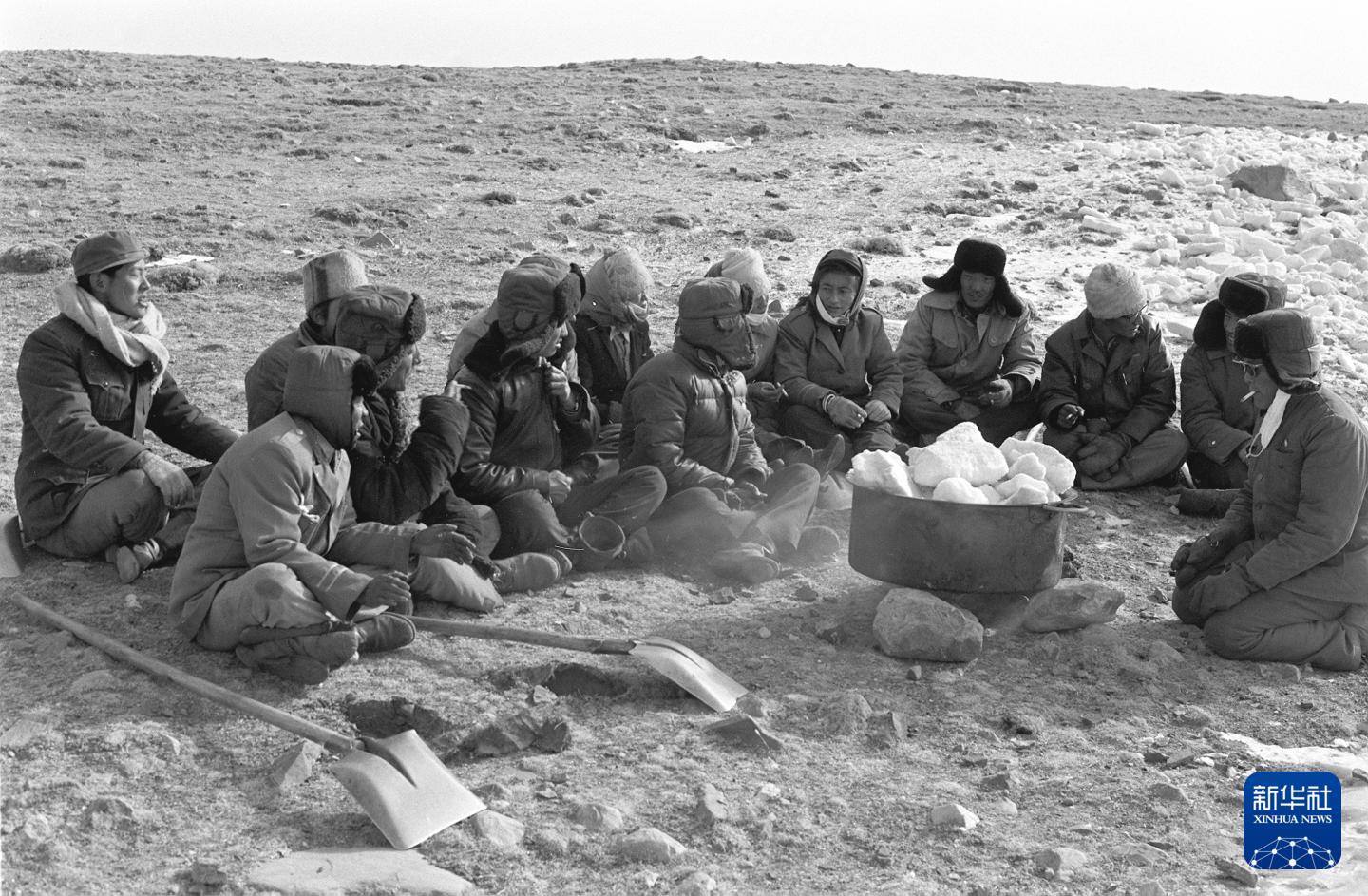 唐古拉山上常年居住着10多名藏族养路工,他们担负着维修和保养公路的任务。这是工人们在工地上化冰烧水,准备午餐。(1989年4月29日发)