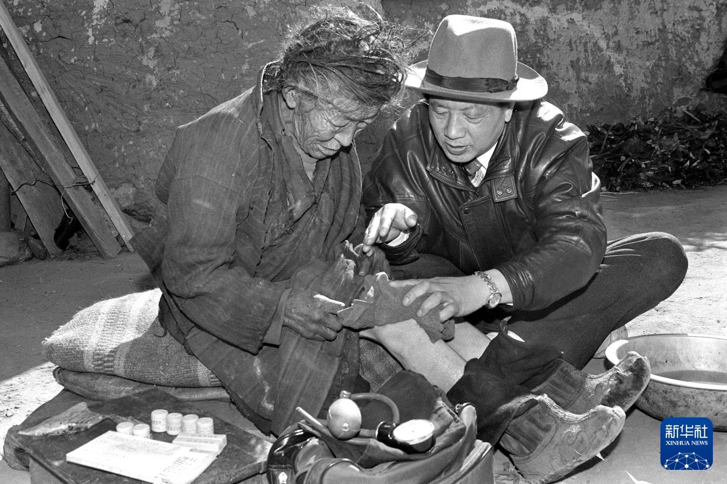 孔繁森在阿里日土县过巴乡为孤寡老人益西卓玛(左)治病。