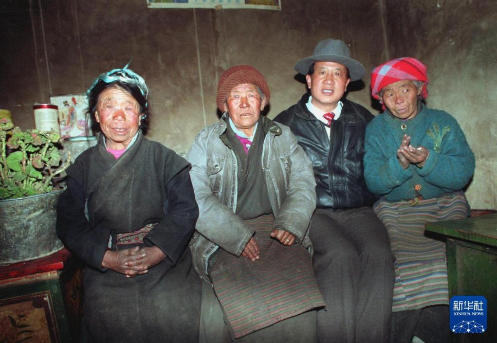 图为时任拉萨副市长孔繁森(右二)和墨竹工卡县敬老院内的三位孤寡老人的合影。