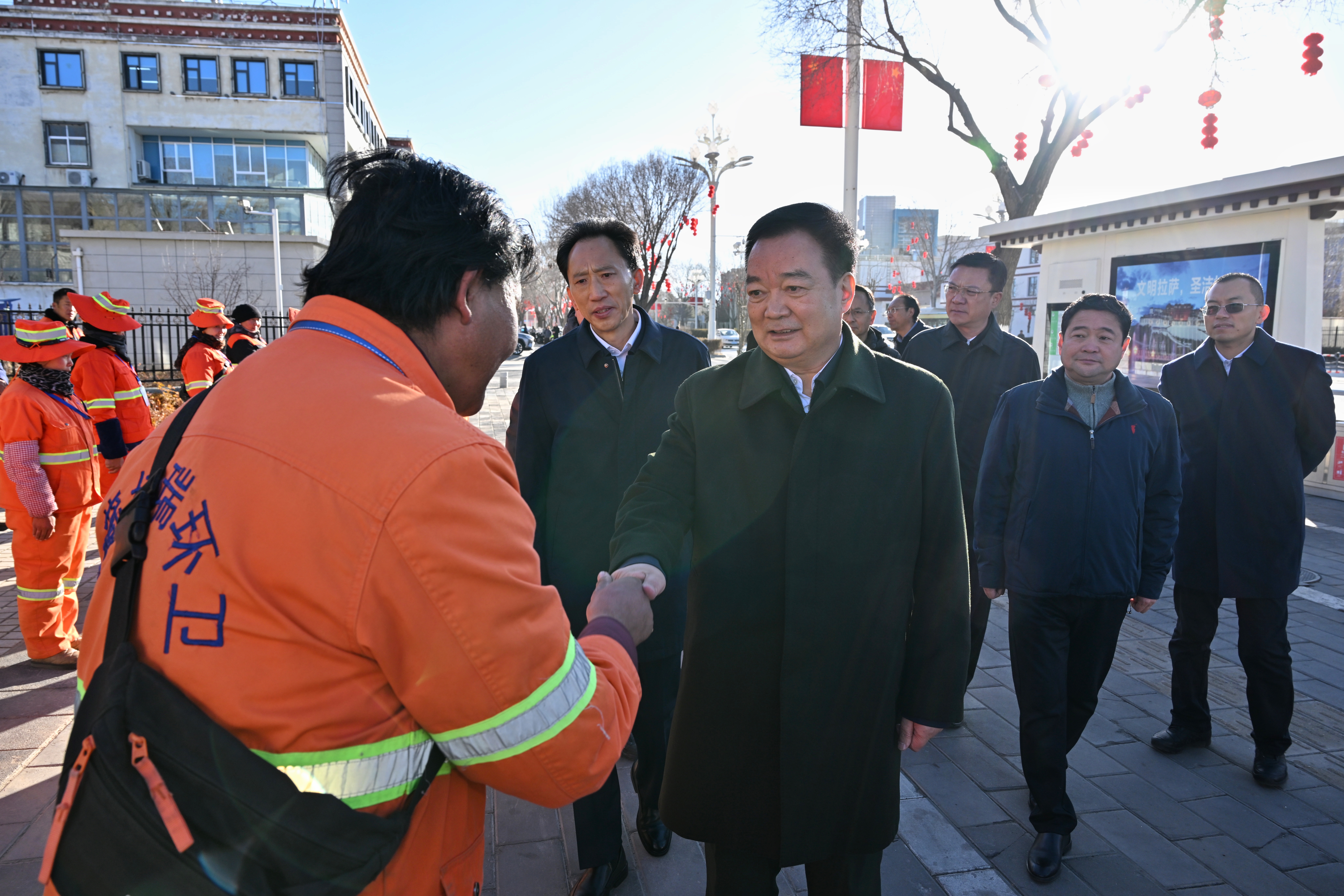 王君正来到拉萨市城关区金珠中路,看望慰问正在作业的环卫工人,感谢大家的默默付出,祝大家新年吉祥、身体健康。“今天的拉萨独具特色、美丽宜居,市民们以生活在这座城市而自豪。你们为城市建设作出了重要贡献,用勤劳双手把城市装扮得更加优美整洁,让市民生活得更加安逸舒适。”越是过节越是辛苦,王君正叮嘱有关部门要进一步关心关爱环卫工人,提升机械作业效率,科学设置休息驿站,做好防寒保暖和安全防护,在全社会营造尊重环卫、关爱环卫、支持环卫的良好氛围。