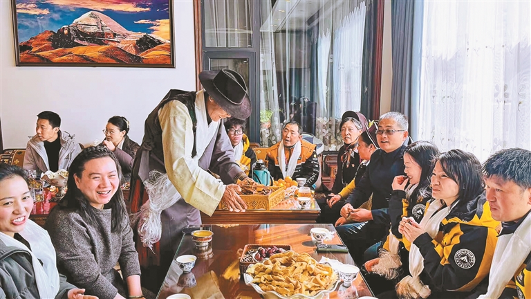 在工作人员的陪同下,新就业群体代表们来到了德吉家。刚踏入院门,身着节日盛装的德吉一家人便热情地迎了上来,献上洁白的哈达,送上“罗萨扎西德勒”(新年快乐)的诚挚祝福。屋内,节日的布置更是让代表们眼前一亮:客厅中央的藏式茶几上,象征着五谷丰登、吉祥如意的“切玛”(五谷斗)绘制着彩色图案,金黄酥脆的“卡塞”(油炸面点)堆叠得错落有致;一旁,风干牦牛肉、人参果饭、青稞酒等独具特色的传统美食琳琅满目,浓郁的“年味”扑面而来。