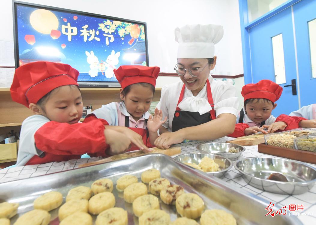 2025年9月30日,河北省石家庄新乐市市直第三幼儿园的孩子在老师的指导下制作传统月饼。(贾敏杰摄/光明图片)