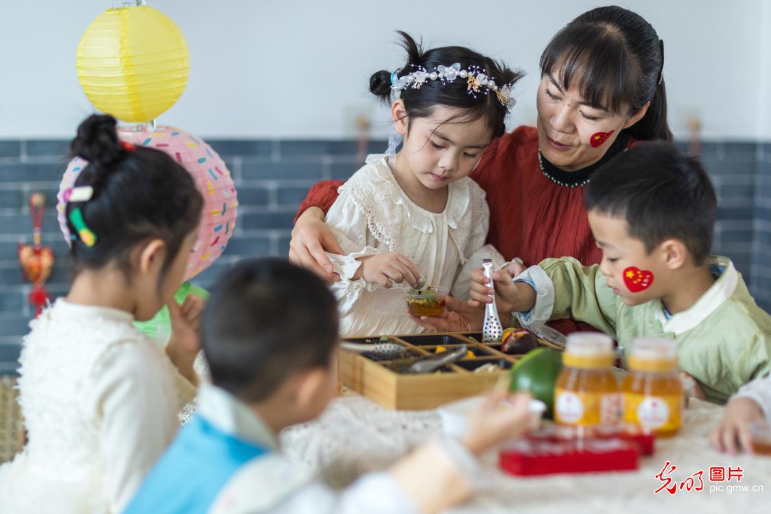 2025年9月30日,甘肃省张掖市甘州区第一幼儿园的小朋友们正在体验制作桂花酿,喜迎国庆和中秋佳节。