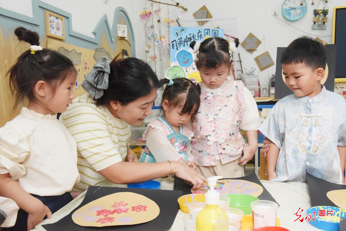 2025年9月29日,江西省分宜县总幼儿园一分园举行“月圆映中秋童心庆国庆”为主题的喜迎国庆、中秋双节活动,让孩子们在欢乐中感受传统文化的魅力,传承爱国情怀。当日,各班孩子们在老师的指导下,开展了学做中秋月饼、绘制荷灯、搭建天安门城楼积木、十米长卷绘画等丰富多彩的活动,用孩子们喜欢的方式,传递文化与精神,陪伴孩子们快乐成长。(袁建兵摄/光明图片)