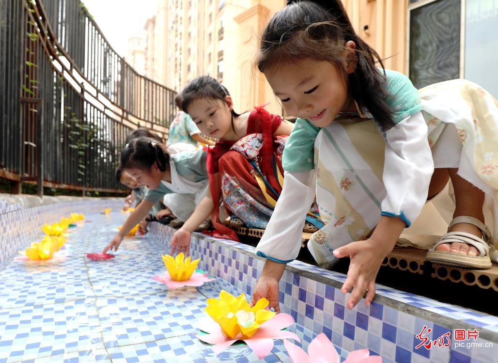 2025年9月30日,在江西省九江市都昌县中心幼儿园,小朋友在老师的指导下放河灯。