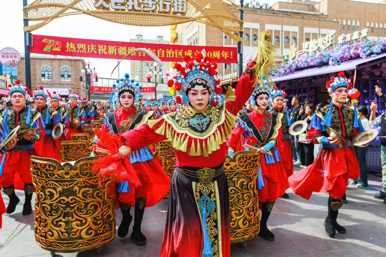 2025年10月1日,新疆国际大巴扎,陕西神木杨家战鼓队为市民和游客表演《忠勇杨家鼓》。本次展演以鼓为媒介,特邀曾荣获2025年“陕北榆林过大年”全国秧歌展演最佳表演奖第一名,并赴德国、法国等进行非遗交流的陕西神木杨家战鼓队担纲主演,把优秀非遗文化带到新疆。(孙振嵩/摄)