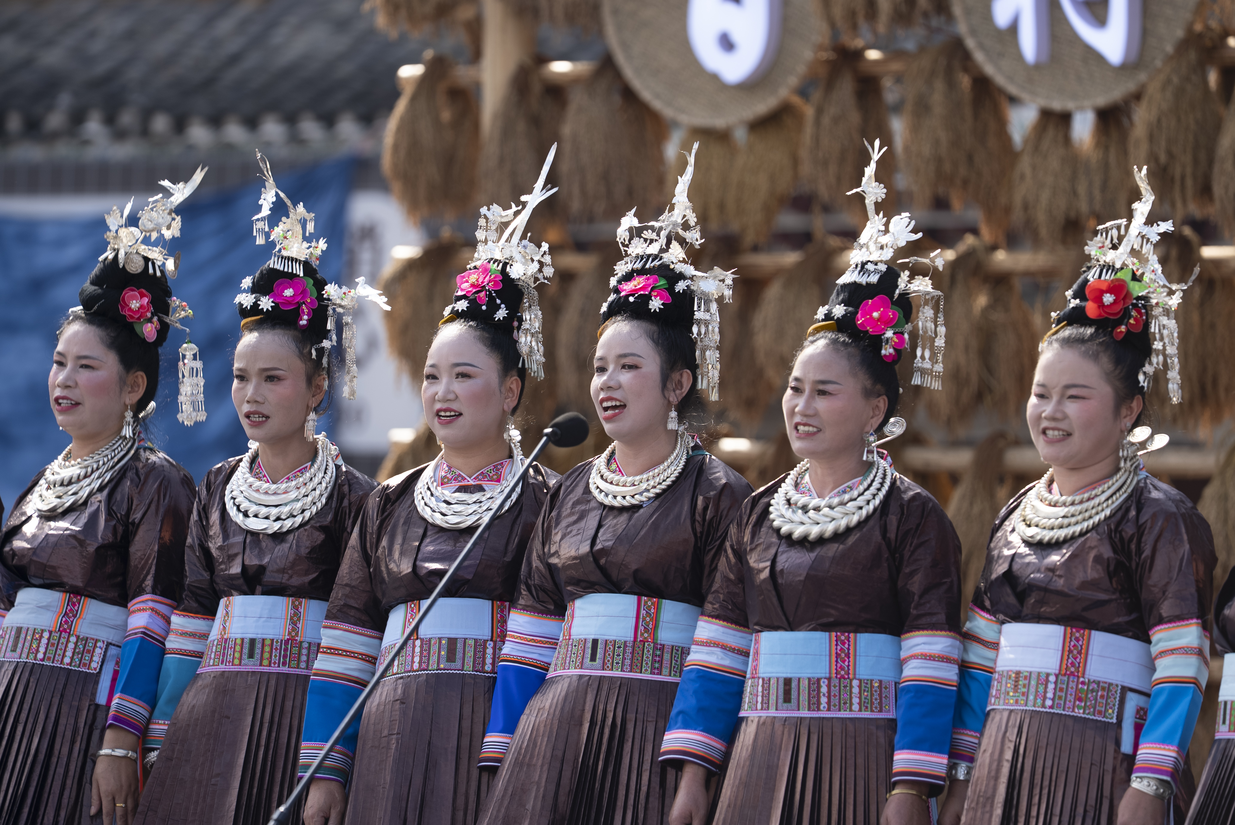 2025年10月1日,贵州省黔东南苗族侗族自治州从江县举行贵州从江第十八届侗族大歌节暨百村歌唱大赛。参赛选手在比赛中演唱侗族大歌。(吴兴科/摄)
