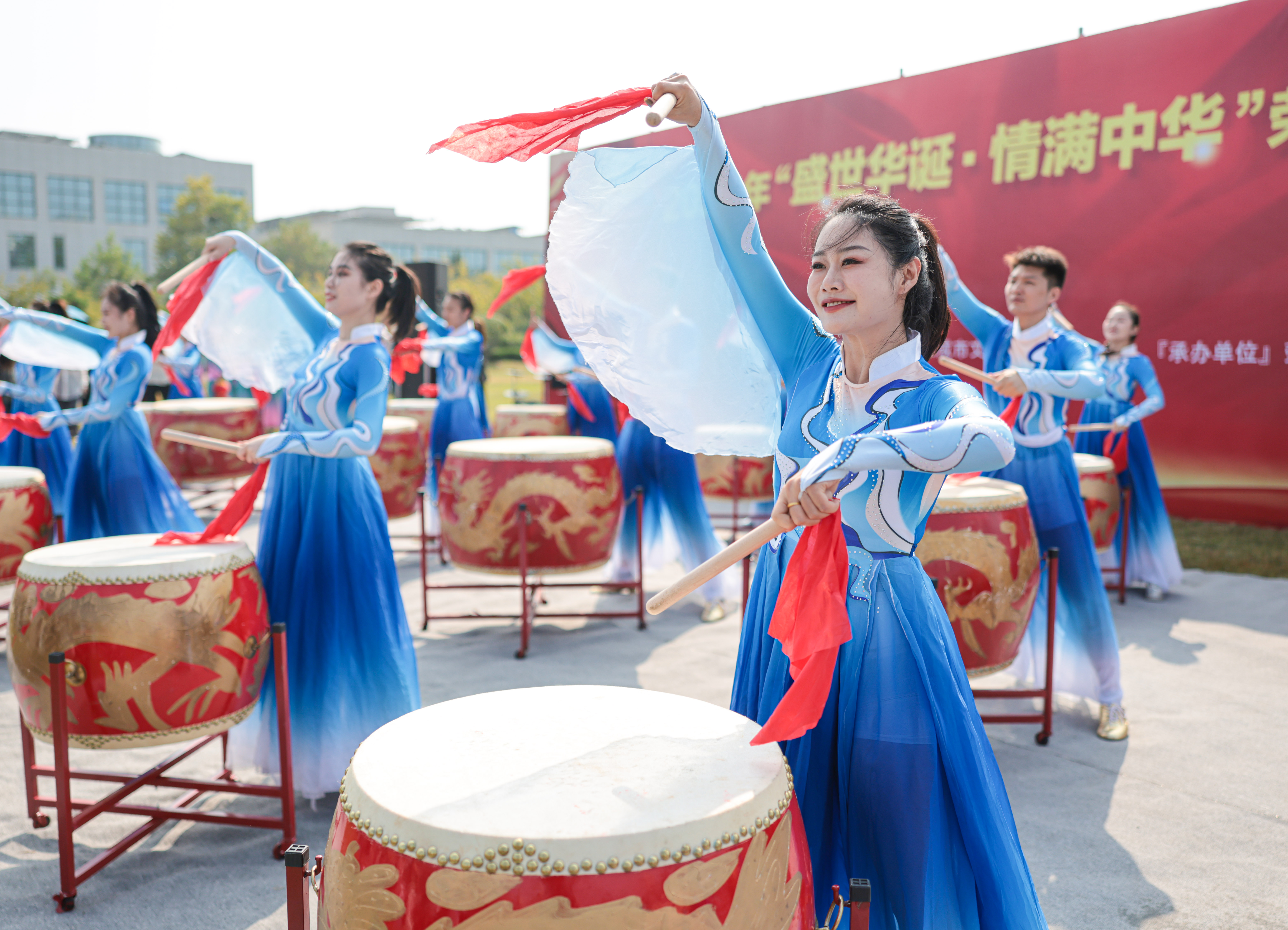 2025年10月1日,在山东省荣成市樱花湖体育公园,民间艺人在表演渔家大鼓,鼓声震云霄,让素有中国渔民文化之乡美誉的荣成节日氛围格外浓厚。(李信君/摄)