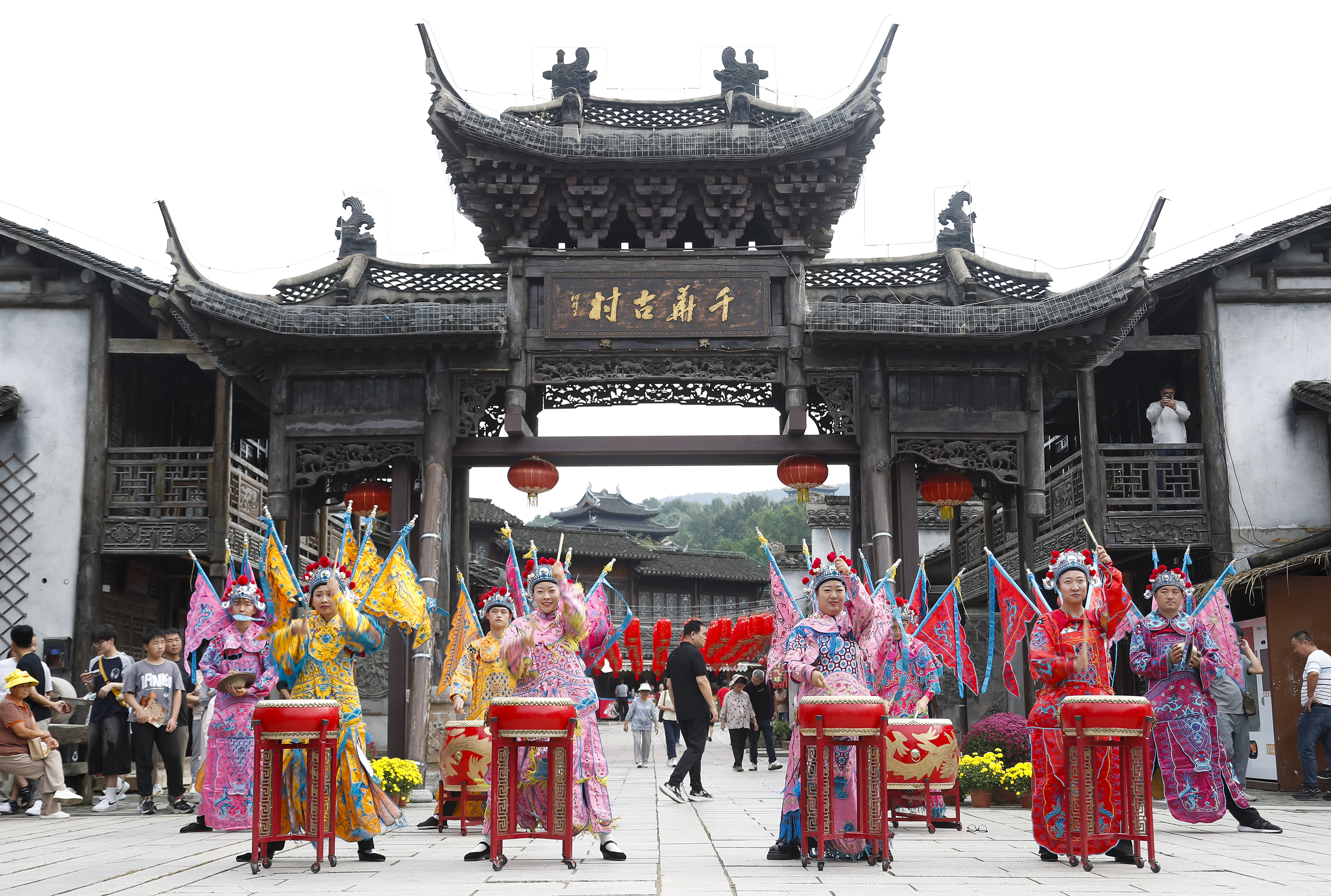 2025年10月1日,演员在江苏省句容市宝华山国家森林公园进行绛州鼓乐非遗表演。不少市民和游客来到江苏省句容市宝华山国家森林公园看风景、赏民俗、品美食,欢度国庆假期。(钟学满/摄)
