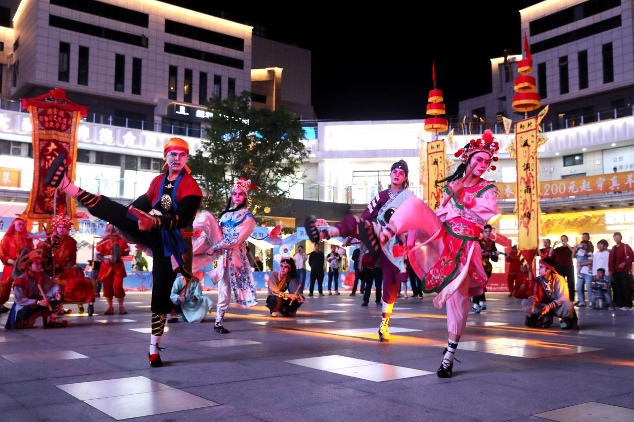 2025年9月30日晚,安徽省蒙城县鲲鹏广场,市民在欣赏非遗表演英歌舞。让市民游客近距离感受传统文化,助力文旅融合发展,快乐开心过长假。(胡卫国/摄)