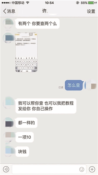 北青报记者联系到一位自称可以查访客的许郡(化名),许郡介绍了两种查询方式,分别是“查最近来访”和“查频繁来访”,并称前者人数会有很多,后者只能查前七个,每项收费10元,查询后也可以把“教程”发来。