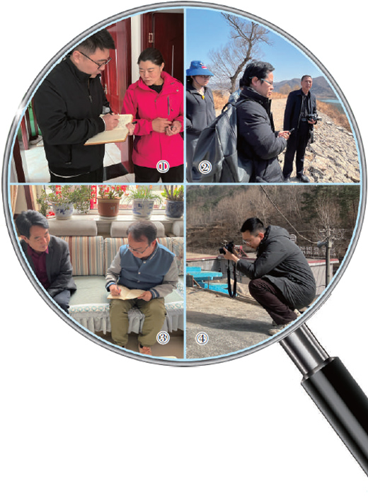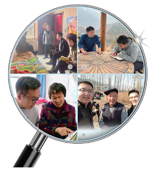 图①至图⑧依次为本报政治文化部记者史一棋(左),海外版记者彭训文(左二),国际部记者周輖(右),地方部记者门杰伟,评论部记者孟繁哲(右一)、内参部记者李维俊(右二),经济社会部记者葛孟超(右),体育部记者王亮(左),海外版记者杨俊峰(左一)、新媒体中心记者李思尧(右一)在河北滦平县驻村蹲点调研活动中深入采访。