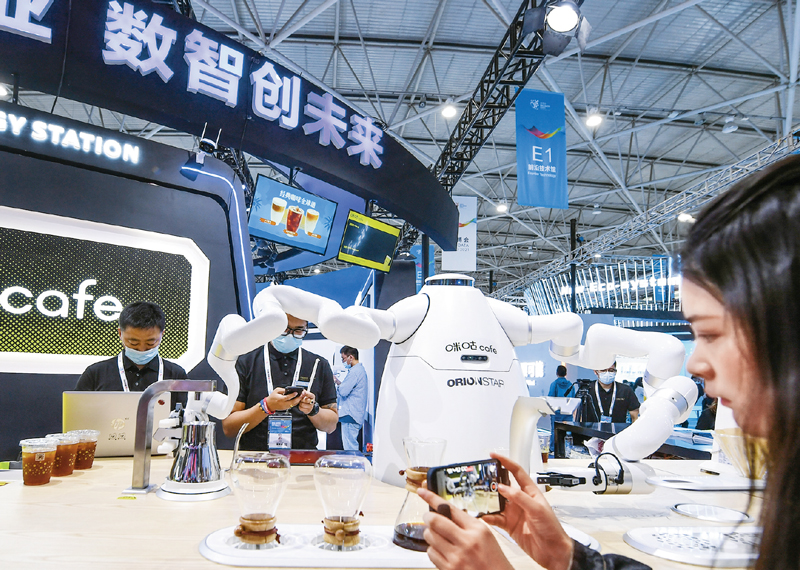 2021年5月26日,以“数智变·物致新”为主题的2021中国国际大数据产业博览会在贵州省贵阳市开幕,会上的5G应用、智能机器人、大数据等展示引人瞩目。图为参会者在博览会上拍摄AI“咖大师”机器人制作咖啡。 新华社记者 杨文斌/摄