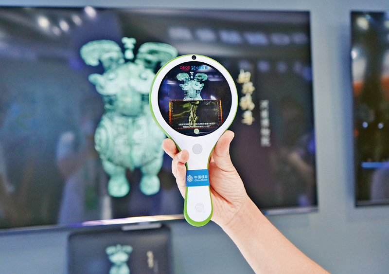 2021中国国际数字经济博览会于9月6日至8日在河北省石家庄市举行,共有468家企业参展,汇聚了国内外数字经济领域众多知名企业。图为工作人员展示通过AR探索镜扫描获取文物相关信息。 新华社记者 金皓原/摄