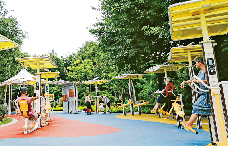2021年,福建省福州市鼓楼区西河智慧体育公园向公众开放。公园内设置30台智能竞赛健身车、椭圆漫步机、体质监测器、智能健身驿站等智慧健身设备,采用太阳能供电,市民锻炼时可看到时间、步数、卡路里等数据,有效提升市民参与运动的互动感和热情度。图为市民正在体验智慧健身设备。 中新社发 谢贵明/摄