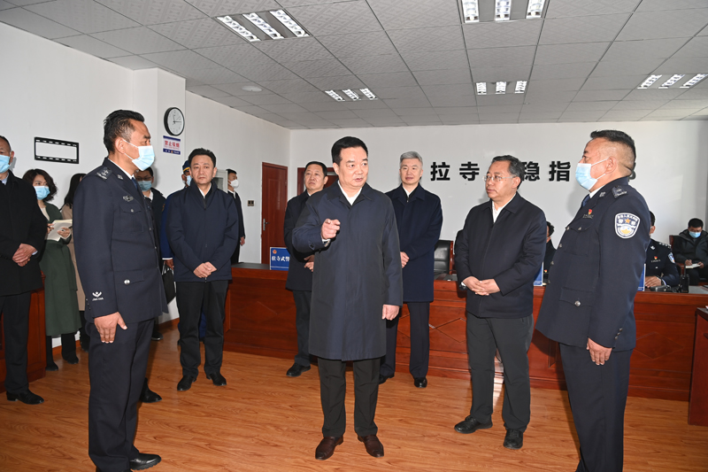 2月16日上午,自治区党委书记王君正在自治区政法系统调研。这是王君正在拉萨市公安局基索派出所看望慰问基层民警、执勤官兵和各方面维稳安保力量。记者 旦增西旦 摄
