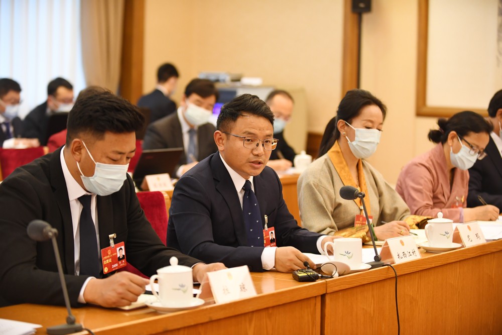 图为来自山南市隆子县斗玉珞巴民族乡的全国人大代表扎西江村在西藏代表团审议时发言。记者 李洲 摄