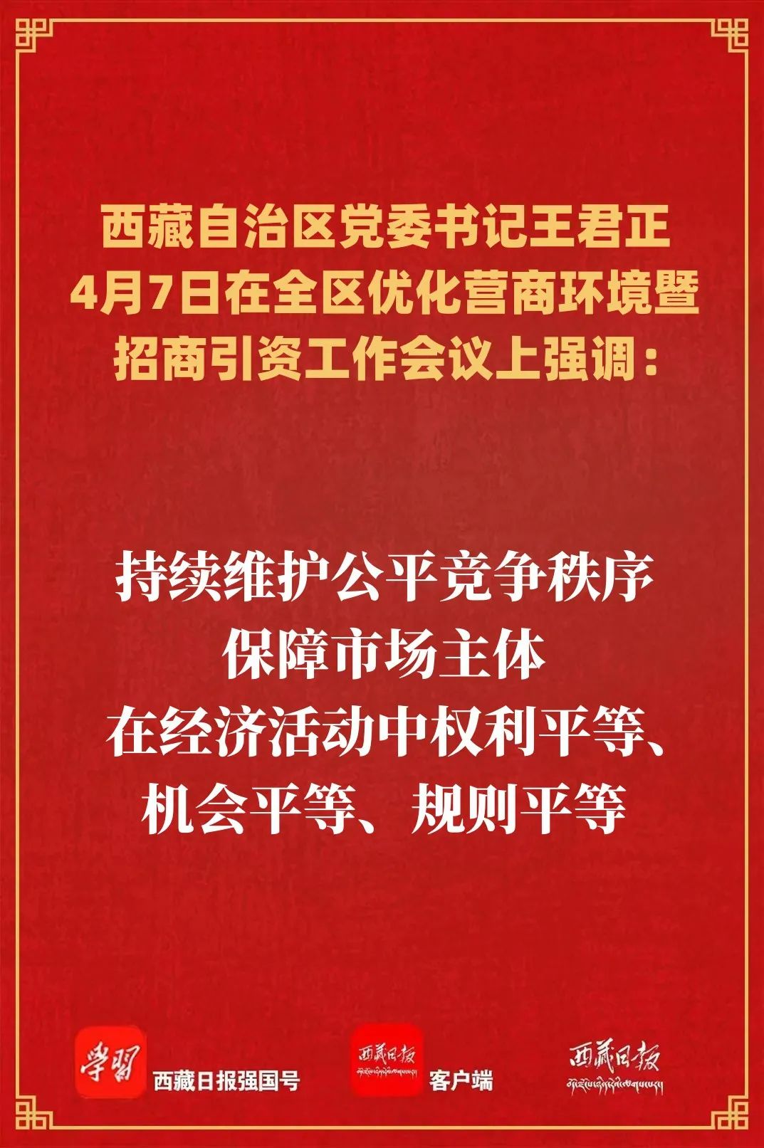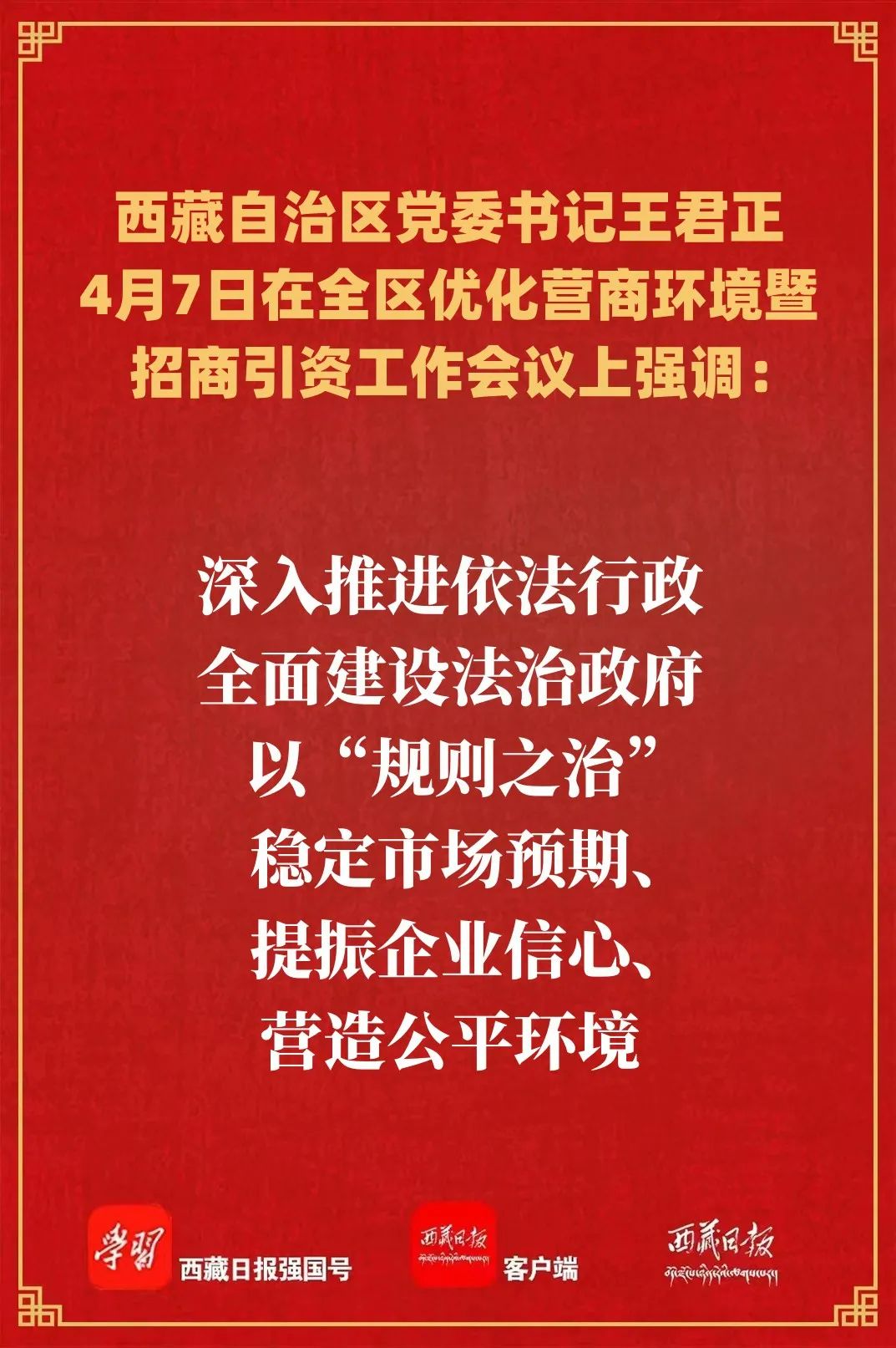 4月7日,全区优化营商环境暨招商引资工作会议在拉萨召开。自治区党委书记王君正出席并讲话。强调,要坚持以党的二十大精神为统领,全面贯彻落实习近平总书记关于优化营商环境、西藏工作的重要指示和新时代党的治藏方略,总结经验、巩固成果,进一步改进作风狠抓落实,优化营商环境,不断提高招商引资工作水平,努力促进经济高质量发展。