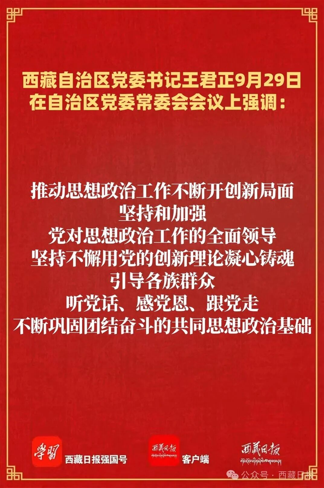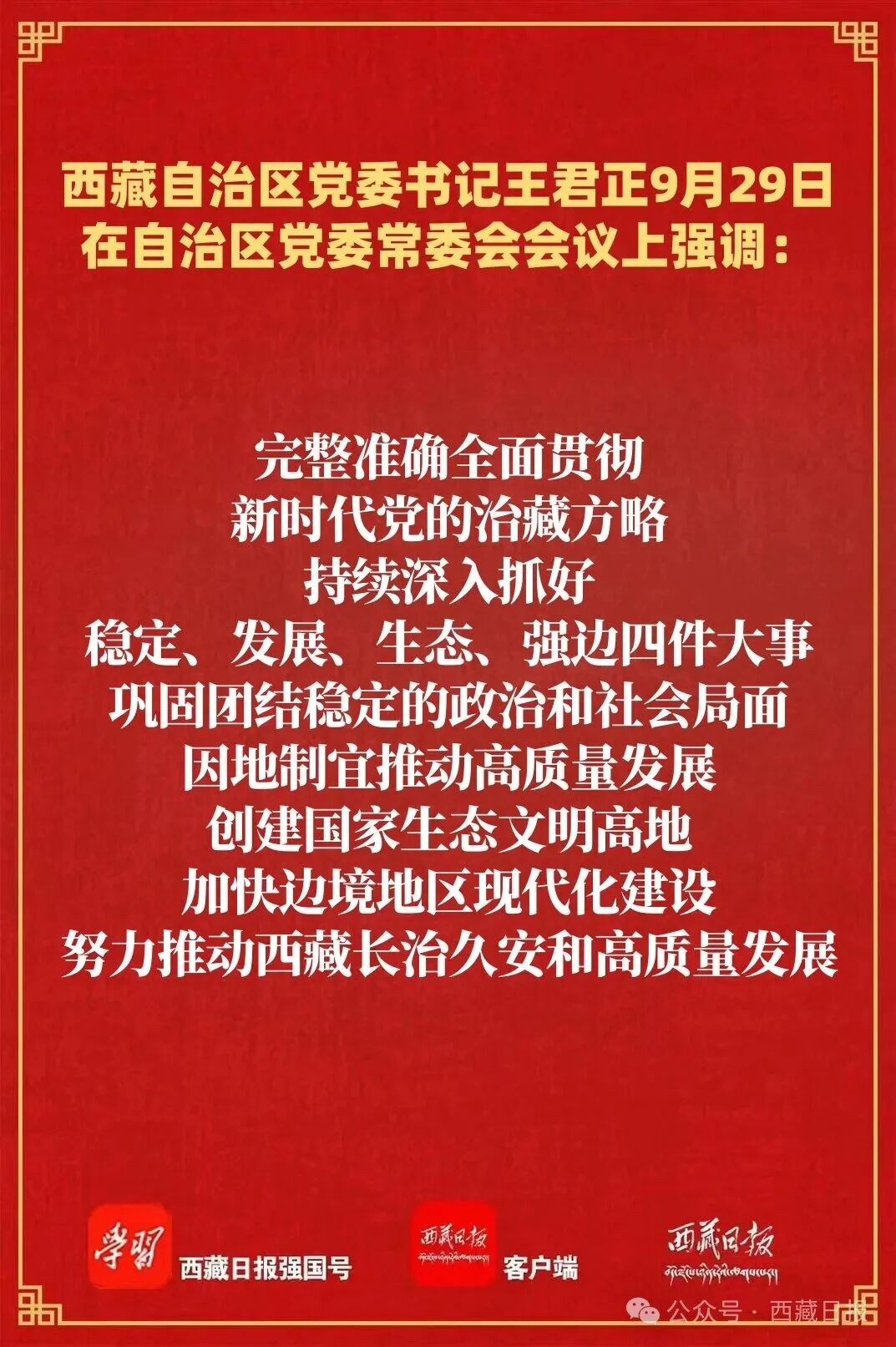 王君正强调,要加强组织领导,持续改进作风狠抓落实,确保各项工作落到实处。以党的政治建设为统领,全面加强党的建设,增强党组织政治功能和组织功能,确保党的各级组织坚强有力、全面过硬。推动作风建设常态化长效化,严格遵守中央八项规定及其实施细则精神,坚决克服形式主义、官僚主义,巩固雪域高原风清气正的政治生态。