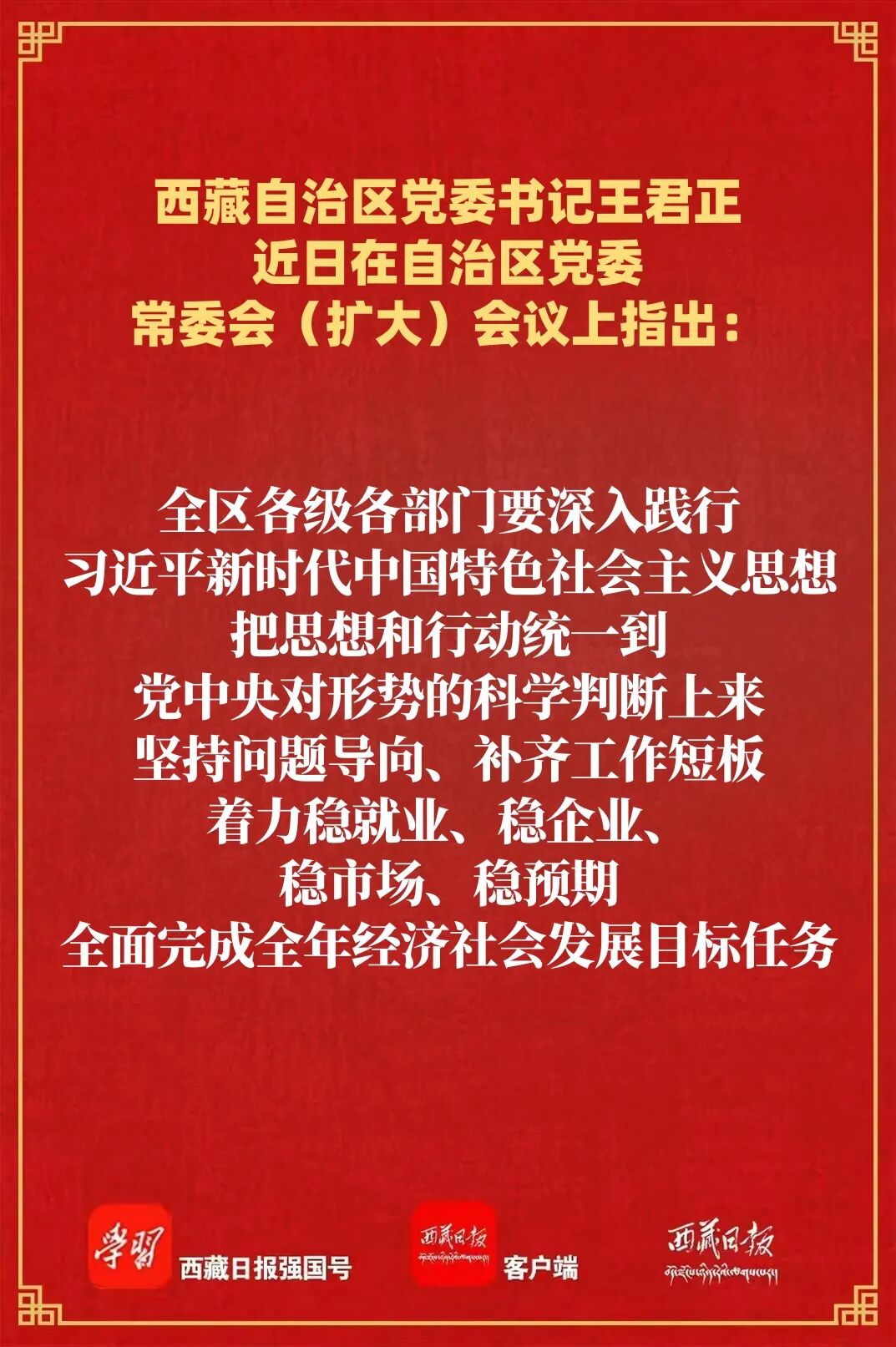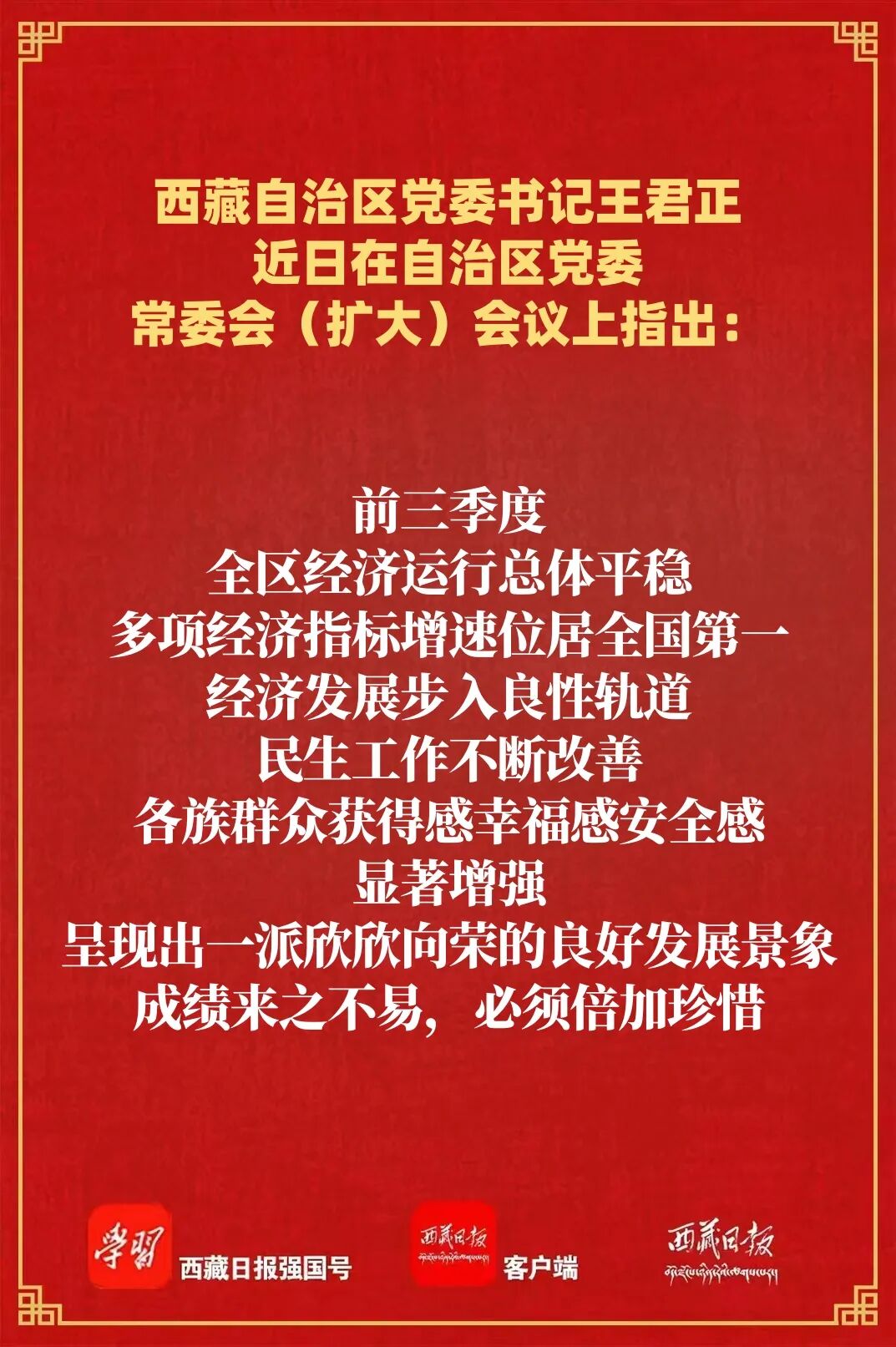 王君正指出,今年以来,在以习近平同志为核心的党中央坚强领导下,自治区党委坚决贯彻落实习近平经济思想、习近平总书记关于西藏工作的重要指示和新时代党的治藏方略,推动各项事业迈出新的坚实步伐。前三季度,全区经济运行总体平稳,多项经济指标增速位居全国第一,经济发展步入良性轨道,民生工作不断改善,各族群众获得感幸福感安全感显著增强,呈现出一派欣欣向荣的良好发展景象。成绩来之不易,必须倍加珍惜。今年是“十四五”规划收官之年,第四季度是实现全年目标任务的关键季、决胜季,全区各级各部门要深入践行习近平新时代中国特色社会主义思想,把思想和行动统一到党中央对形势的科学判断上来,坚持问题导向、补齐工作短板,着力稳就业、稳企业、稳市场、稳预期,全面完成全年经济社会发展目标任务。