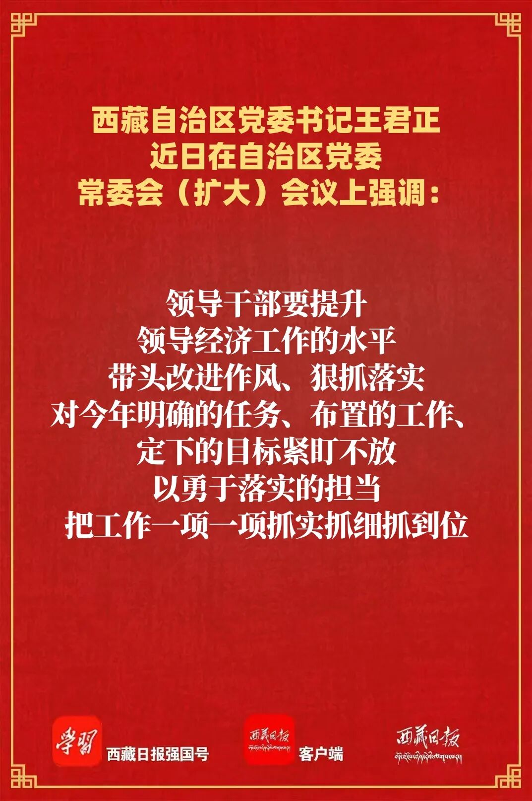 王君正强调,要加强对经济工作的领导,着力做好重点地区、重点行业、重点企业的工作。领导干部要提升领导经济工作的水平,带头改进作风、狠抓落实,对今年明确的任务、布置的工作、定下的目标紧盯不放,以勇于落实的担当,把工作一项一项抓实抓细抓到位。坚持典型引路,深化经验总结,激励真抓实干,持续营造良好社会氛围,推动党中央决策部署和自治区党委工作安排落到实处,为西藏长治久安和高质量发展奠定良好基础。