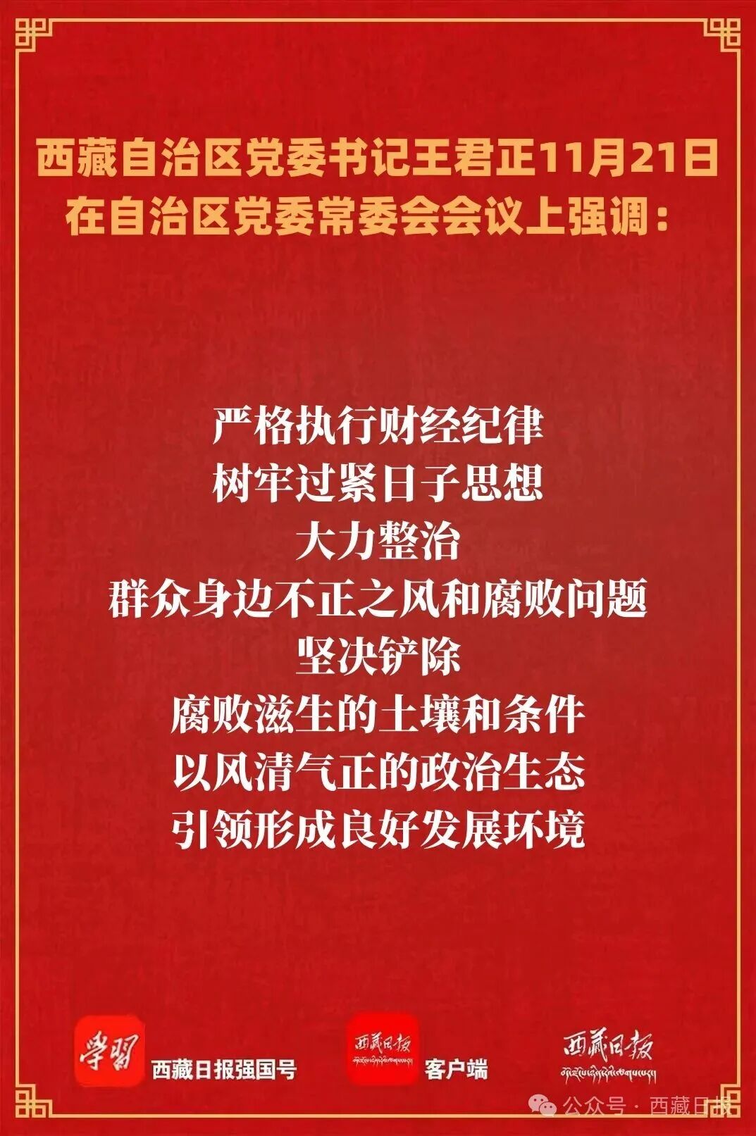 会议传达学习了习近平总书记在广东考察、听取海南自由贸易港建设工作汇报时、在中共中央党外人士座谈会上的重要讲话精神等。王君正指出,习近平总书记重要讲话重要指示,政治性、思想性、指导性强,为我们做好西藏工作指明了前进方向、提供了根本遵循。全区各级各部门要深刻领悟“两个确立”的决定性意义,认真学习领会习近平总书记重要讲话重要指示精神,深入学习贯彻党的二十届四中全会精神,积极研究新情况、主动解决新问题、不断探索新机制,确保党中央决策部署在雪域高原落地生根、开花结果。