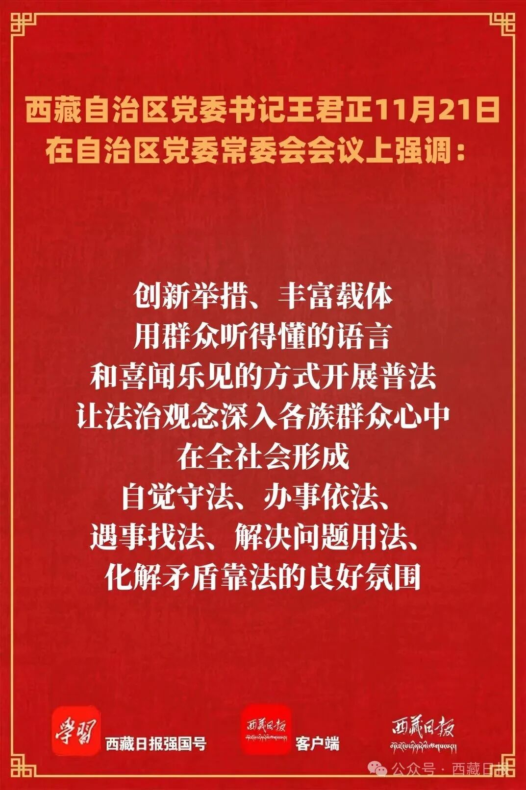 会议传达学习了习近平总书记对全面依法治国工作作出的重要指示精神和中央全面依法治国工作会议精神,研究审议了自治区相关法规草案。王君正强调,要深入贯彻落实习近平法治思想,努力掌握蕴含其中的科学世界观和方法论,推动理论武装走深走实,更好指导法治西藏建设实践,不断开创依法治藏工作新局面;领导干部要带头尊法学法守法用法,努力提高运用法治思维和法治方式的能力和水平。更好发挥服务保障作用,聚焦“四件大事”聚力“四个创建”,找准法治服务保障西藏长治久安和高质量发展的切入点,提升科学立法质量,加强重点领域立法,真正做到以良法促进发展、保障善治。持续推进法治政府建设,健全重大行政决策制度,狠抓政法领域改革,严格规范公正文明执法司法,实现政府治理信息化与法治化深度融合,推进各项事务治理制度化、规范化、程序化,切实提升政府公信力。加强法治宣传教育,创新举措、丰富载体,用群众听得懂的语言和喜闻乐见的方式开展普法,让法治观念深入各族群众心中,在全社会形成自觉守法、办事依法、遇事找法、解决问题用法、化解矛盾靠法的良好氛围。
