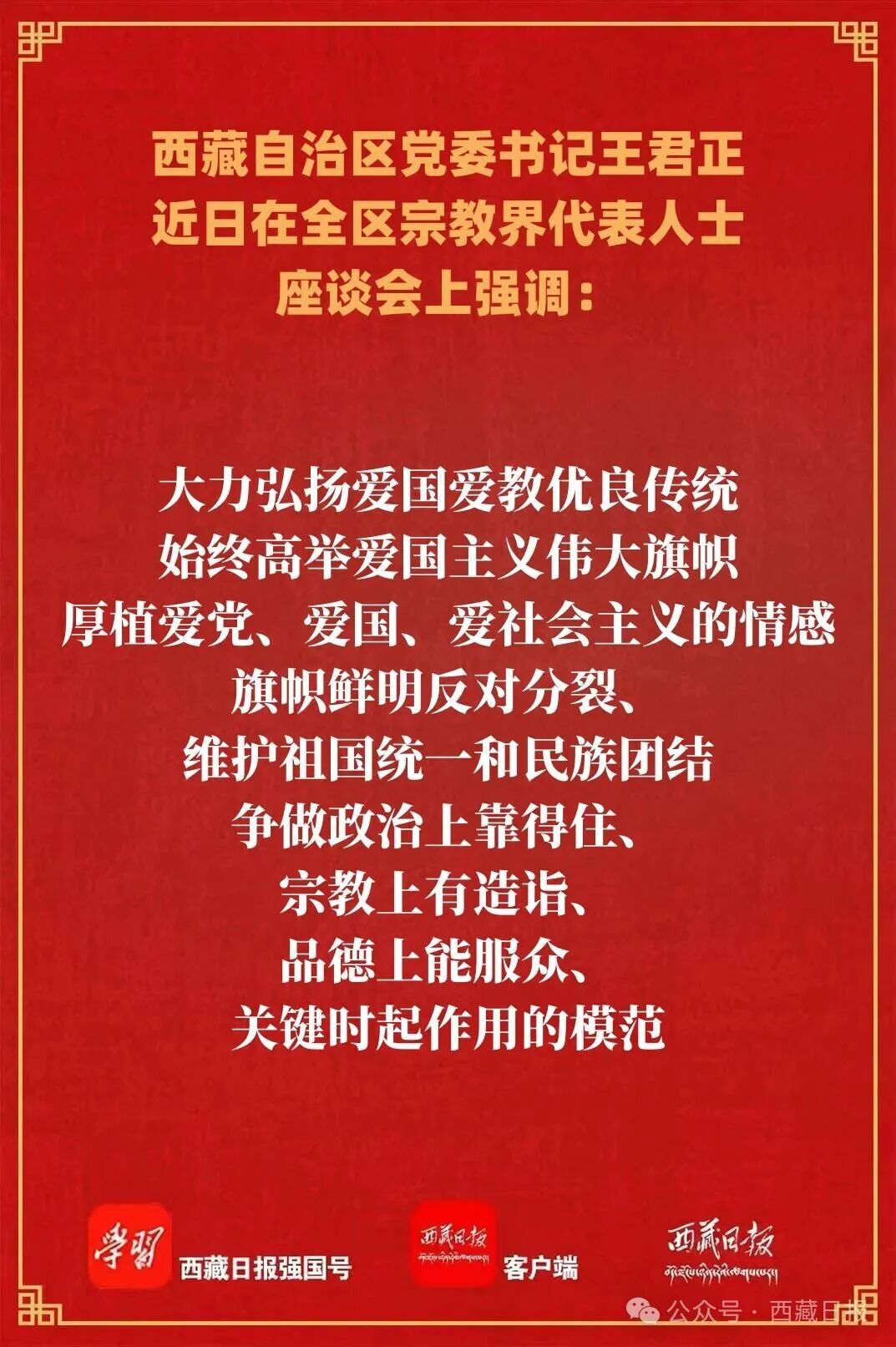 王君正强调,要充分发挥宗教界代表人士示范引领作用,共同谱写中国式现代化西藏实践新篇章。大力弘扬爱国爱教优良传统,始终高举爱国主义伟大旗帜,厚植爱党、爱国、爱社会主义的情感,旗帜鲜明反对分裂、维护祖国统一和民族团结,争做政治上靠得住、宗教上有造诣、品德上能服众、关键时起作用的模范。积极引导信教群众正信正行,潜心修持、精进学修,不断提高宗教修为、道德素养和学识水平,广泛宣传大活佛转世历史定制、宗教仪轨和政策法规,在引导向上向善、弘扬正能量上发挥作用。凝聚共同团结奋进的力量,牢牢把握团结奋斗的时代要求,积极参与民族团结进步创建工作,引导广大僧尼和信教群众共同推动稳定、发展、生态、强边四件大事落实。