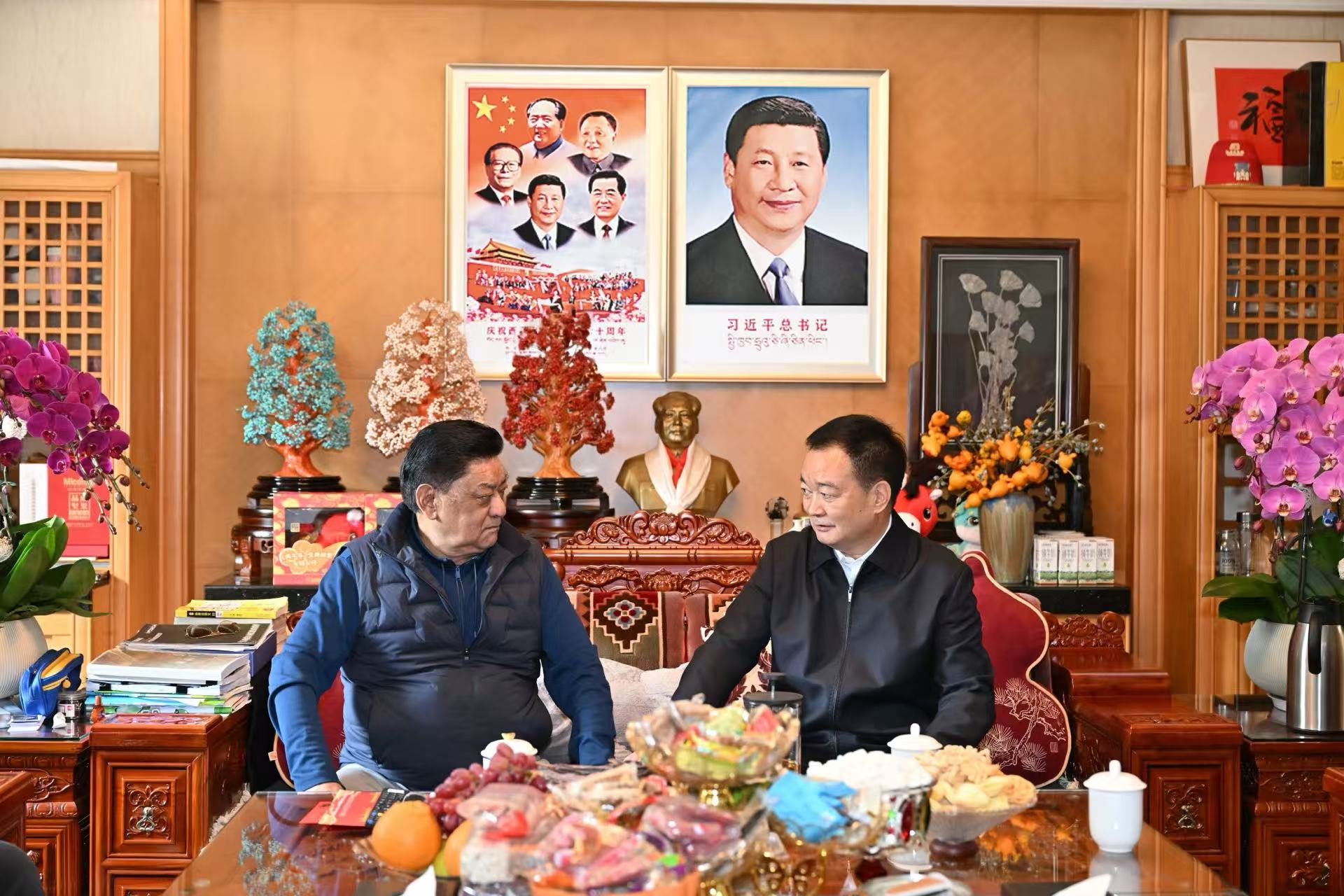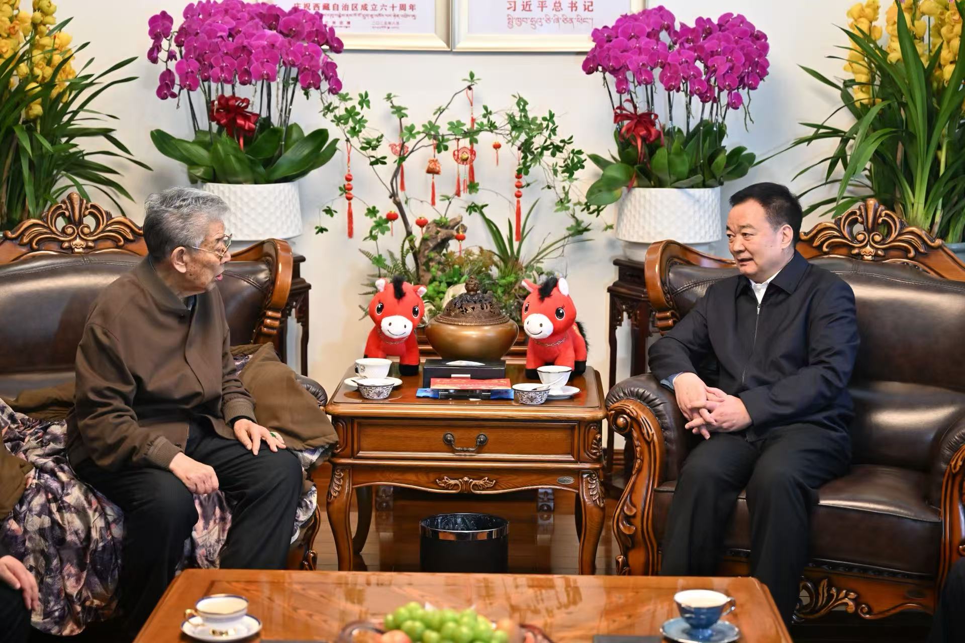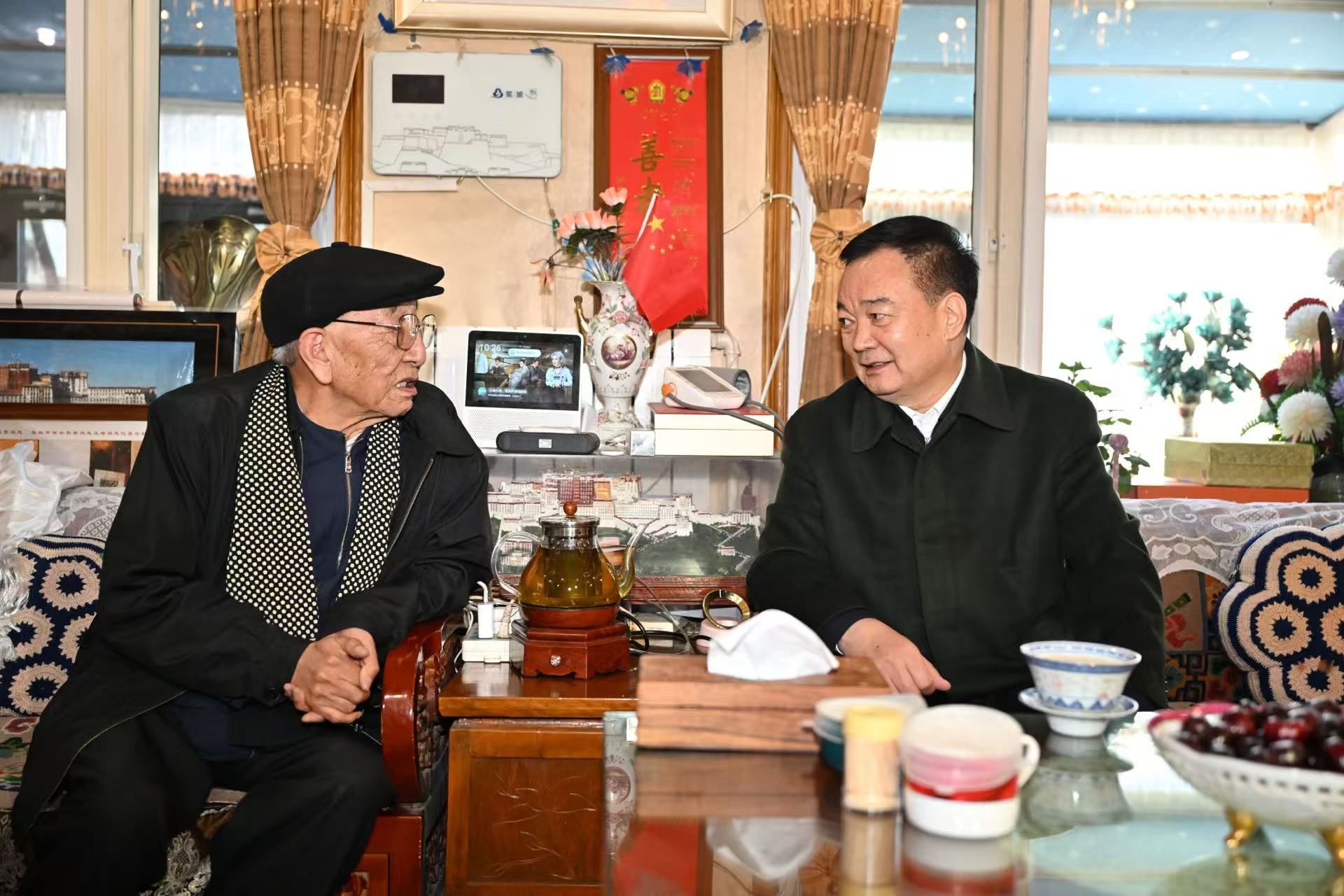 春节、藏历新年即将到来之际,自治区党委书记王君正分别在成都、拉萨看望慰问老领导老同志。这是王君正看望慰问十三届全国人大常委会副委员长白玛赤林。记者 旦增西旦 摄