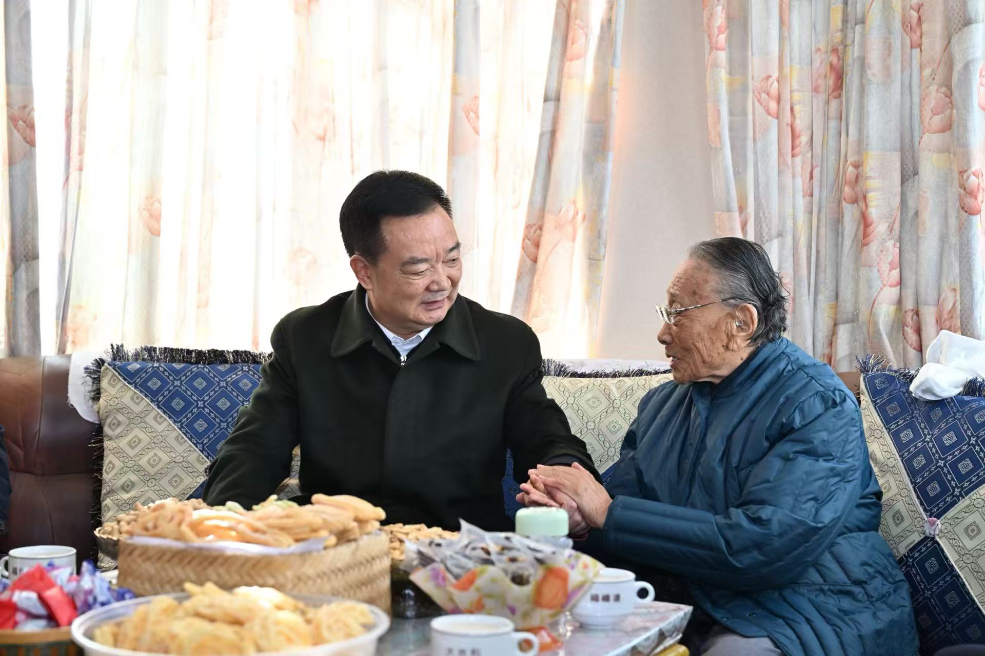 春节、藏历新年即将到来之际,自治区党委书记王君正分别在成都、拉萨看望慰问老领导老同志。这是王君正看望慰问列确。记者 旦增西旦 摄