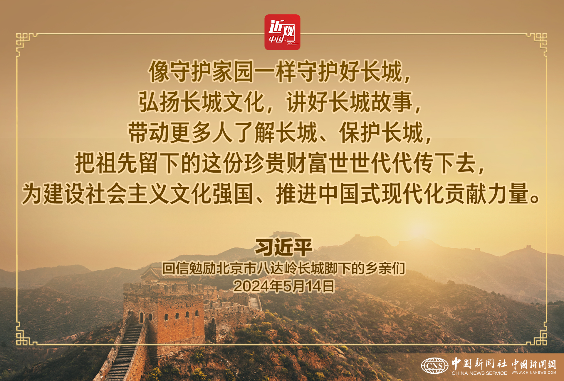习近平强调,长城是中华民族的代表性符号和中华文明的重要象征,凝聚着中华民族自强不息的奋斗精神和众志成城、坚韧不屈的爱国情怀。保护好、传承好这一历史文化遗产,是我们共同的责任。希望大家接续努力、久久为功,像守护家园一样守护好长城,弘扬长城文化,讲好长城故事,带动更多人了解长城、保护长城,把祖先留下的这份珍贵财富世世代代传下去,为建设社会主义文化强国、推进中国式现代化贡献力量。