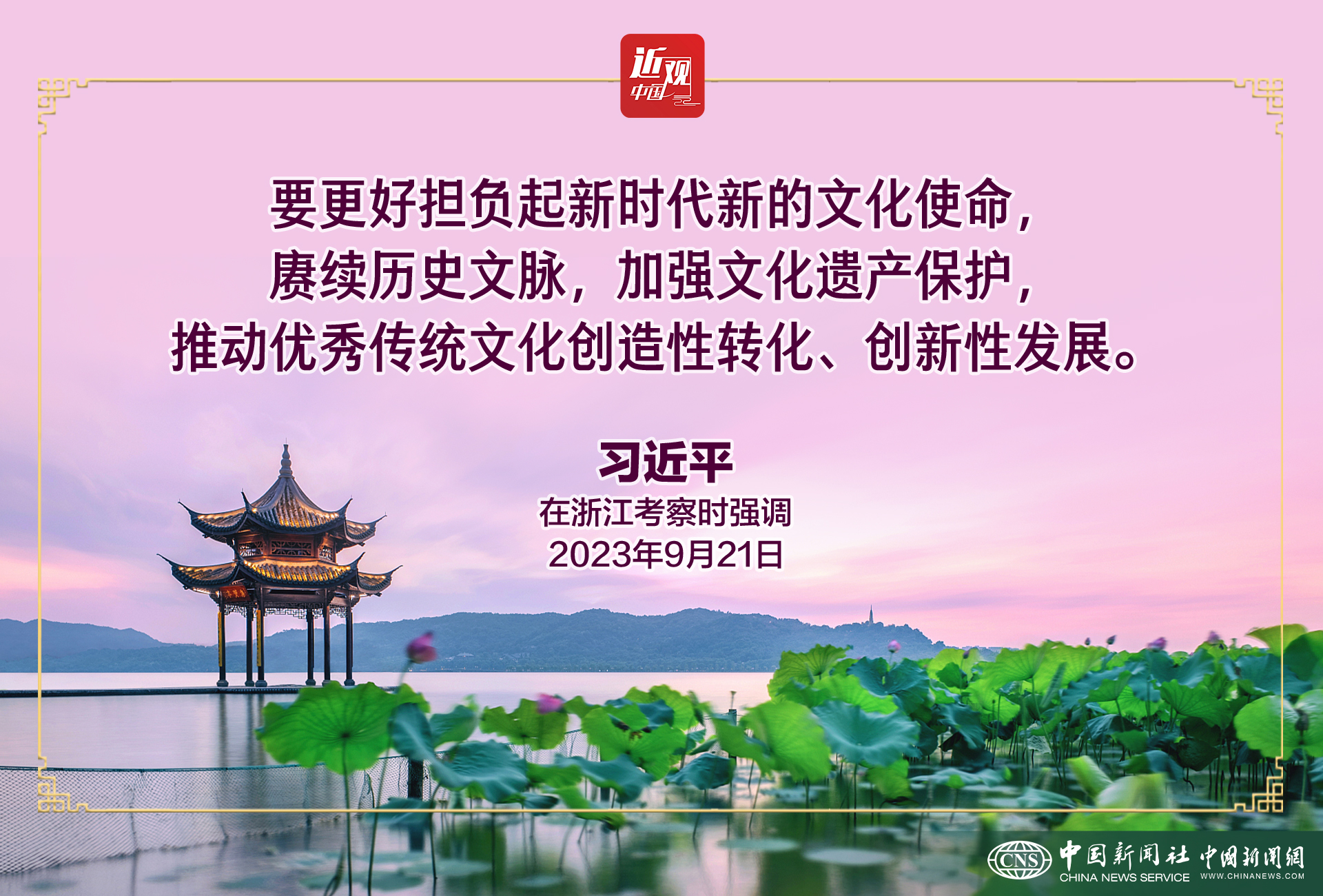 习近平强调,浙江要在建设中华民族现代文明上积极探索。要更好担负起新时代新的文化使命,赓续历史文脉,加强文化遗产保护,推动优秀传统文化创造性转化、创新性发展。坚守中华文化立场,积极发展反映时代要求、具有时代特色的新文化,发展中华文明的现代形态。