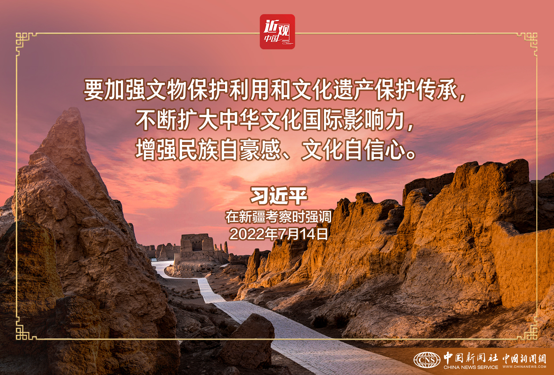 习近平强调,文物和文化遗产承载着中华民族的基因和血脉,是不可再生、不可替代的中华优秀文明资源。要让更多文物和文化遗产活起来,营造传承中华文明的浓厚社会氛围。要积极推进文物保护利用和文化遗产保护传承,挖掘文物和文化遗产的多重价值,传播更多承载中华文化、中国精神的价值符号和文化产品。