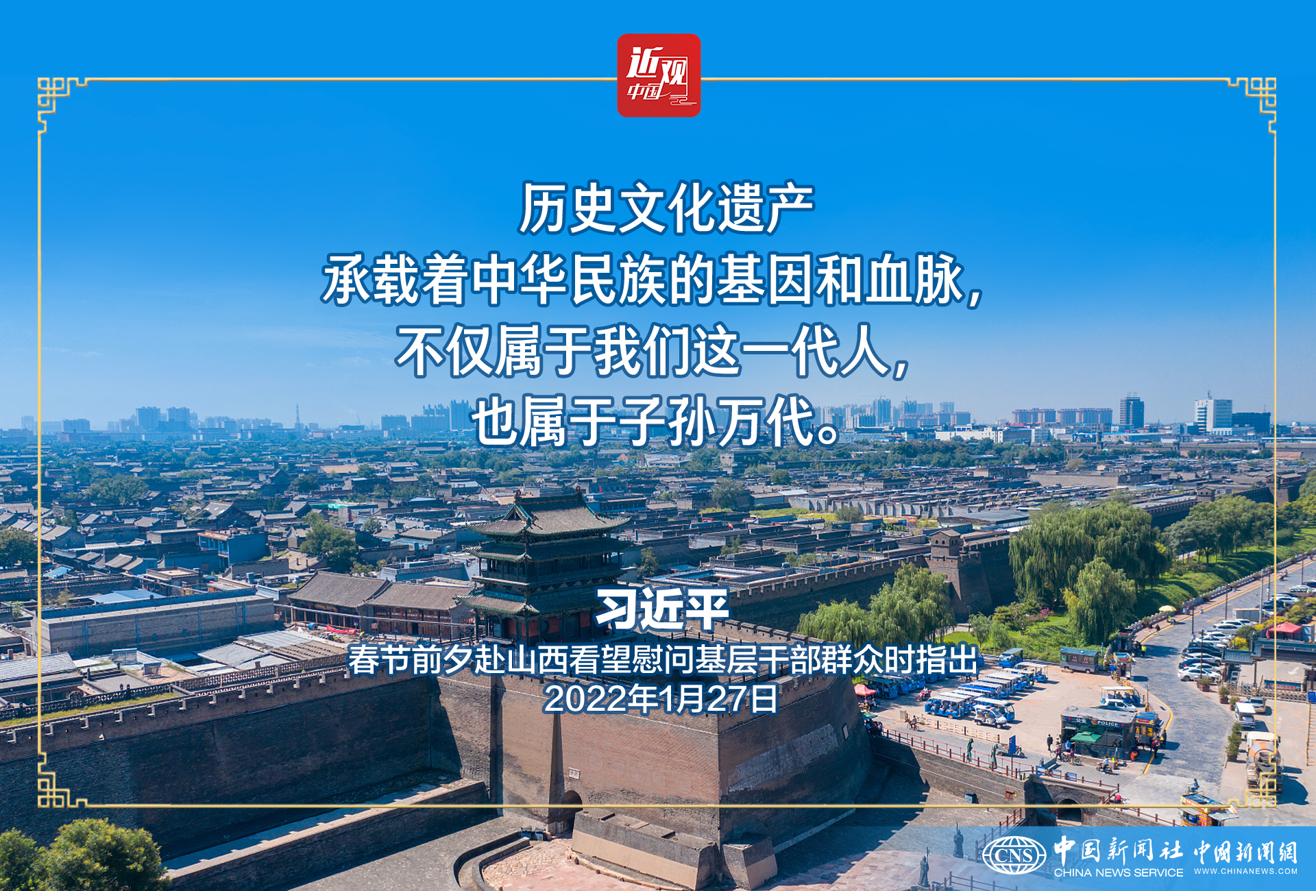 27日,习近平在晋中市考察调研。他指出,历史文化遗产承载着中华民族的基因和血脉,不仅属于我们这一代人,也属于子孙万代。要敬畏历史、敬畏文化、敬畏生态,全面保护好历史文化遗产,统筹好旅游发展、特色经营、古城保护,筑牢文物安全底线,守护好前人留给我们的宝贵财富。
