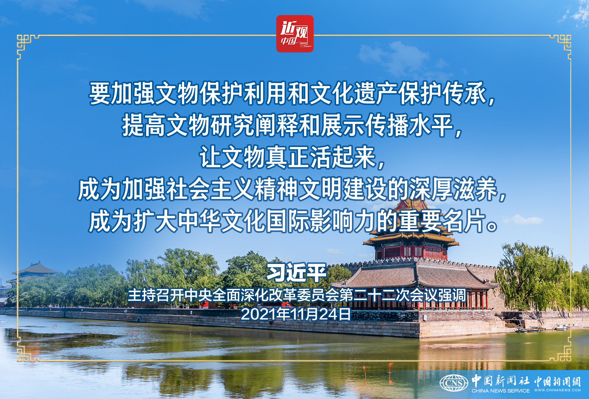 习近平在主持会议时强调,要加强文物保护利用和文化遗产保护传承,提高文物研究阐释和展示传播水平,让文物真正活起来,成为加强社会主义精神文明建设的深厚滋养,成为扩大中华文化国际影响力的重要名片。