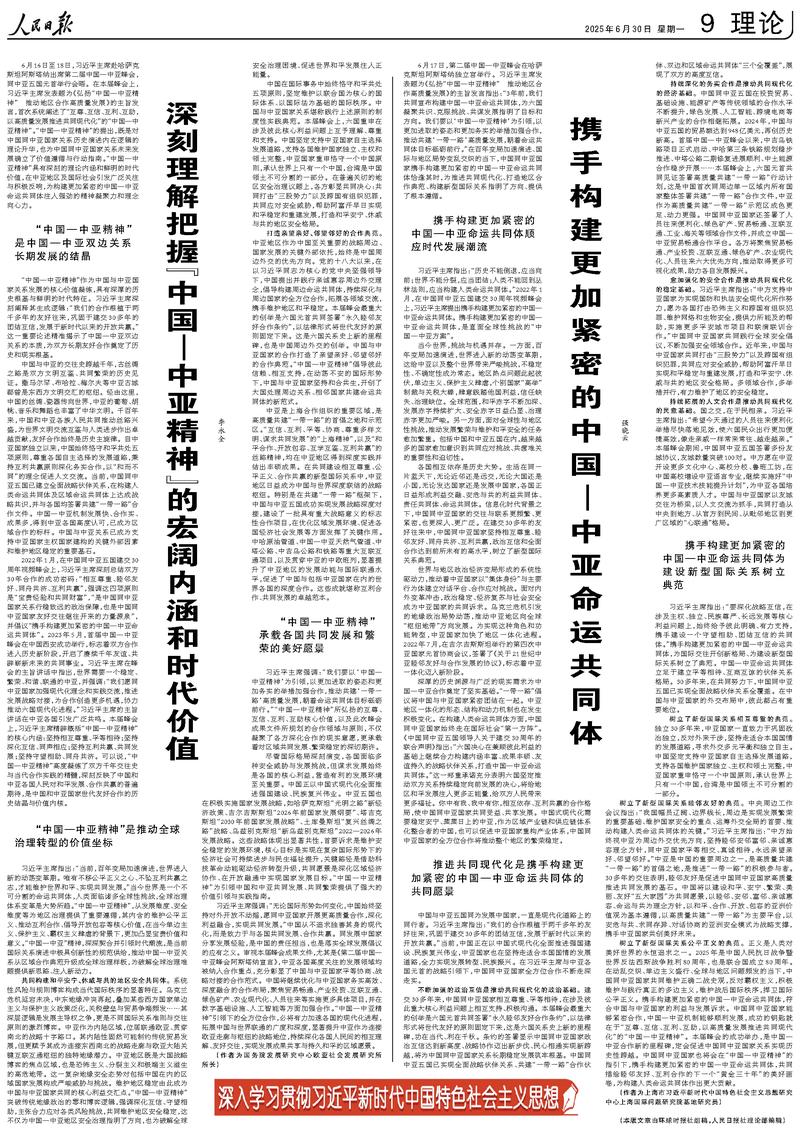 6月16日至18日,习近平主席赴哈萨克斯坦阿斯塔纳出席第二届中国—中亚峰会,同中亚五国元首举行会晤。在本届峰会上,习近平主席发表题为《弘扬“中国—中亚精神” 推动地区合作高质量发展》的主旨发言,首次系统阐述了“互尊、互信、互利、互助,以高质量发展推进共同现代化”的“中国—中亚精神”。“中国—中亚精神”的提出,既是对中国同中亚国家关系历史演进内在逻辑的理论升华,也为中国同中亚国家关系未来发展确立了价值遵循与行动指南。“中国—中亚精神”具有深刻的理论内涵和鲜明的时代价值,在中亚地区及国际社会引发广泛关注与积极反响,为构建更加紧密的中国—中亚命运共同体注入强劲的精神凝聚力和理念向心力。