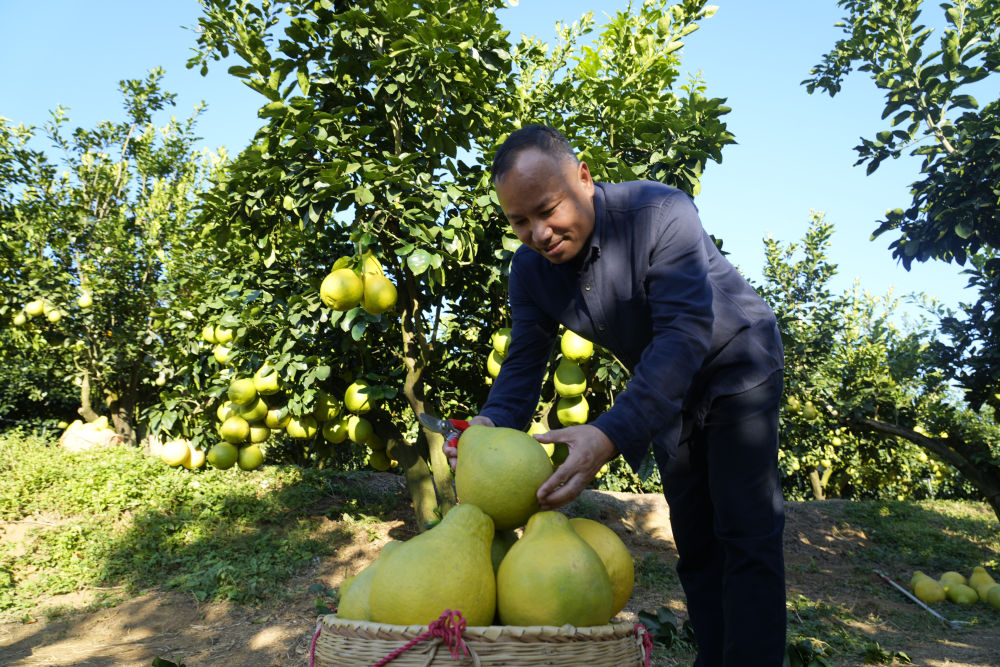 2025年11月7日,柚农在梅州南福金柚种植基地采摘柚子。