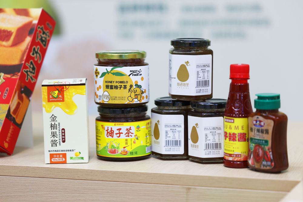 2025年11月7日,柚农在梅州南福金柚种植基地将采摘的柚子装筐。